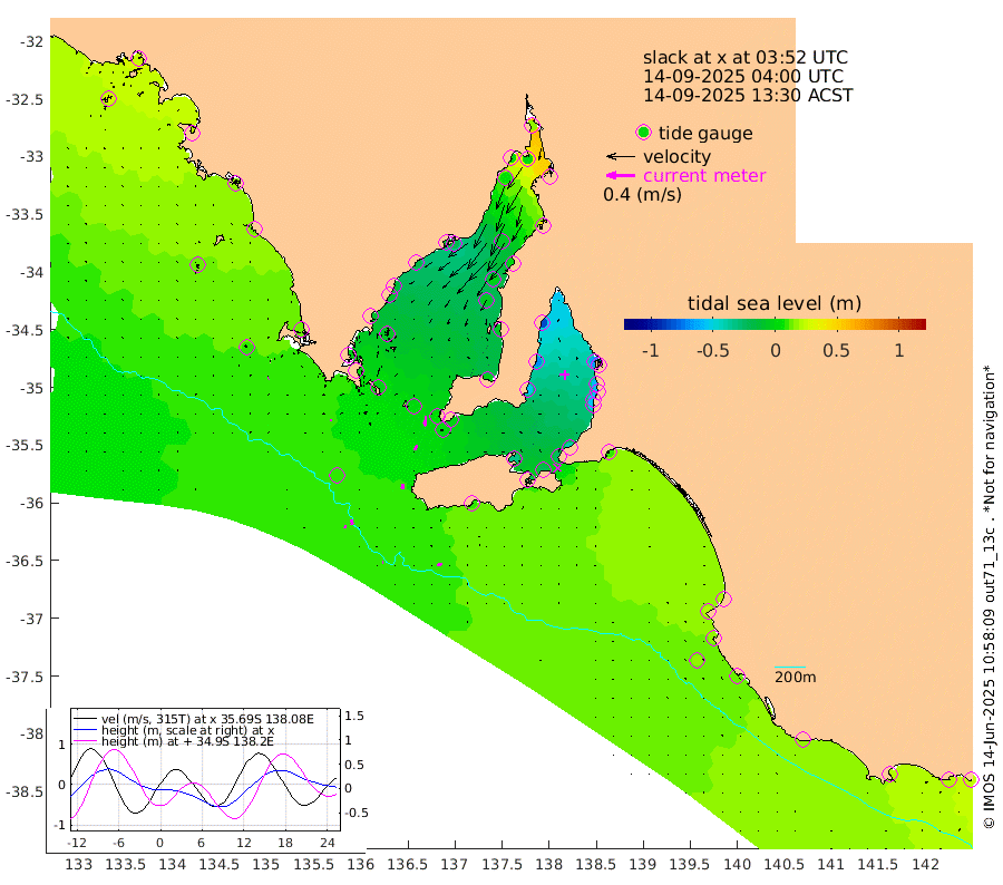 1cm/s -87T +10cm/s rms + 5cm/s 114T. SAM1DS 520m 2cm/s 133T +13cm/s rms + 5cm/s -36T. SAM2CP 100m 7cm/s 174T +21cm/s rms + 18cm/s 142T. SAM3MS 168m 7cm/s -107T +22cm/s rms + 0cm/s -30T. SAM4CY 117m 1cm/s 54T +23cm/s rms + 2cm/s 99T. SAM5CB 94m 8cm/s -151T +8cm/s rms + 3cm/s -172T. SAM6IS 83m 4cm/s 180T +11cm/s rms + 7cm/s 150T. SAM7DS 519m 14cm/s -173T +10cm/s rms + 2cm/s 87T. SAM8SG 47m 8cm/s -172T +20cm/s rms + 12cm/s -168T. NRSKAI 101m 23cm Warrnambool 21cm Port Fairy 19cm Portland 18cm Port Macdonnell 13cm Beachport 15cm Cape Rabelais (off) 17cm Robe 19cm Cape Jaffa 19cm Kingston 11cm Victor Harbor 9cm Vivonne Bay -32cm Kingscote -23cm American River -21cm Penneshaw -23cm Cape Jervis -39cm Second Valley -53cm Port Noarlunga -56cm Port Stanvac -59cm Brighton -60cm Glenelg -67cm Port Adelaide (Outer Harbor) -64cm Angus Inlet (Garden Island) -85cm Ardrossan -69cm Port Vincent -55cm Port Giles -2cm Stenhouse Bay 3cm Althorpe Island 4cm Pondalowie Bay -2cm Point Turton -5cm Port Victoria -7cm Cape Elizabeth -1cm Tiparra Reef Light 0cm Wallaroo -7cm Middle Bank 42cm Port Broughton 22cm Port Pirie 17cm Red Cliff Point (Beacon 5) 3cm Port Bonython 3cm Whyalla 4cm Western Shoal Beacon -10cm Franklin Harbor -20cm Franklin Harbor Entrance Beacon -17cm Arno Bay -15cm Port Neill -11cm Cape Hardy -8cm Tumby Bay -5cm Reevesby Island -3cm Port Lincoln 1cm Taylors Landing -2cm Whalers Bay 2cm Wedge Island Mooring 8cm Shelf Edge Mooring 15cm Coffin Bay Entrance Beacon 10cm Greenly Island 14cm Elliston 13cm Pearson Island 15cm Venus Bay 25cm Blanche Port (Streaky Bay) 23cm Thevenard 29cm St Francis Island