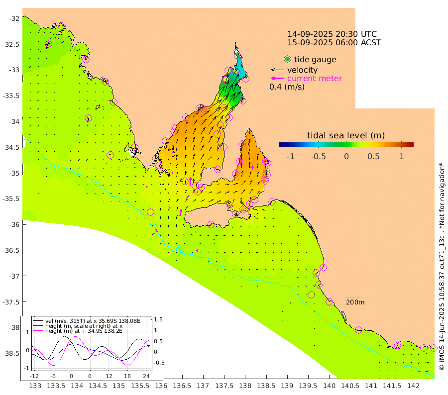 0cm/s 31T +10cm/s rms + 5cm/s 114T. SAM1DS 520m 4cm/s -65T +13cm/s rms + 5cm/s -36T. SAM2CP 100m 9cm/s -25T +21cm/s rms + 18cm/s 142T. SAM3MS 168m 6cm/s -24T +22cm/s rms + 0cm/s -30T. SAM4CY 117m 3cm/s -115T +23cm/s rms + 2cm/s 99T. SAM5CB 94m 13cm/s 38T +8cm/s rms + 3cm/s -172T. SAM6IS 83m 4cm/s -13T +11cm/s rms + 7cm/s 150T. SAM7DS 519m 26cm/s 2T +10cm/s rms + 2cm/s 87T. SAM8SG 47m 19cm/s 8T +20cm/s rms + 12cm/s -168T. NRSKAI 101m 22cm Warrnambool 21cm Port Fairy 23cm Portland 25cm Port Macdonnell 24cm Beachport 24cm Cape Rabelais (off) 24cm Robe 25cm Cape Jaffa 23cm Kingston 30cm Victor Harbor 23cm Vivonne Bay 60cm Kingscote 51cm American River 57cm Penneshaw 50cm Cape Jervis 61cm Second Valley 72cm Port Noarlunga 75cm Port Stanvac 75cm Brighton 78cm Glenelg 82cm Port Adelaide (Outer Harbor) 66cm Angus Inlet (Garden Island) 97cm Ardrossan 88cm Port Vincent 82cm Port Giles 41cm Stenhouse Bay 40cm Althorpe Island 33cm Pondalowie Bay 52cm Point Turton 51cm Port Victoria 54cm Cape Elizabeth 52cm Tiparra Reef Light 44cm Wallaroo 51cm Middle Bank -16cm Port Broughton 1cm Port Pirie -3cm Red Cliff Point (Beacon 5) 15cm Port Bonython 24cm Whyalla 27cm Western Shoal Beacon 52cm Franklin Harbor 72cm Franklin Harbor Entrance Beacon 69cm Arno Bay 72cm Port Neill 65cm Cape Hardy 61cm Tumby Bay 55cm Reevesby Island 54cm Port Lincoln 42cm Taylors Landing 48cm Whalers Bay 40cm Wedge Island Mooring 27cm Shelf Edge Mooring 27cm Coffin Bay Entrance Beacon 24cm Greenly Island 26cm Elliston 21cm Pearson Island 22cm Venus Bay 26cm Blanche Port (Streaky Bay) 24cm Thevenard 14cm St Francis Island