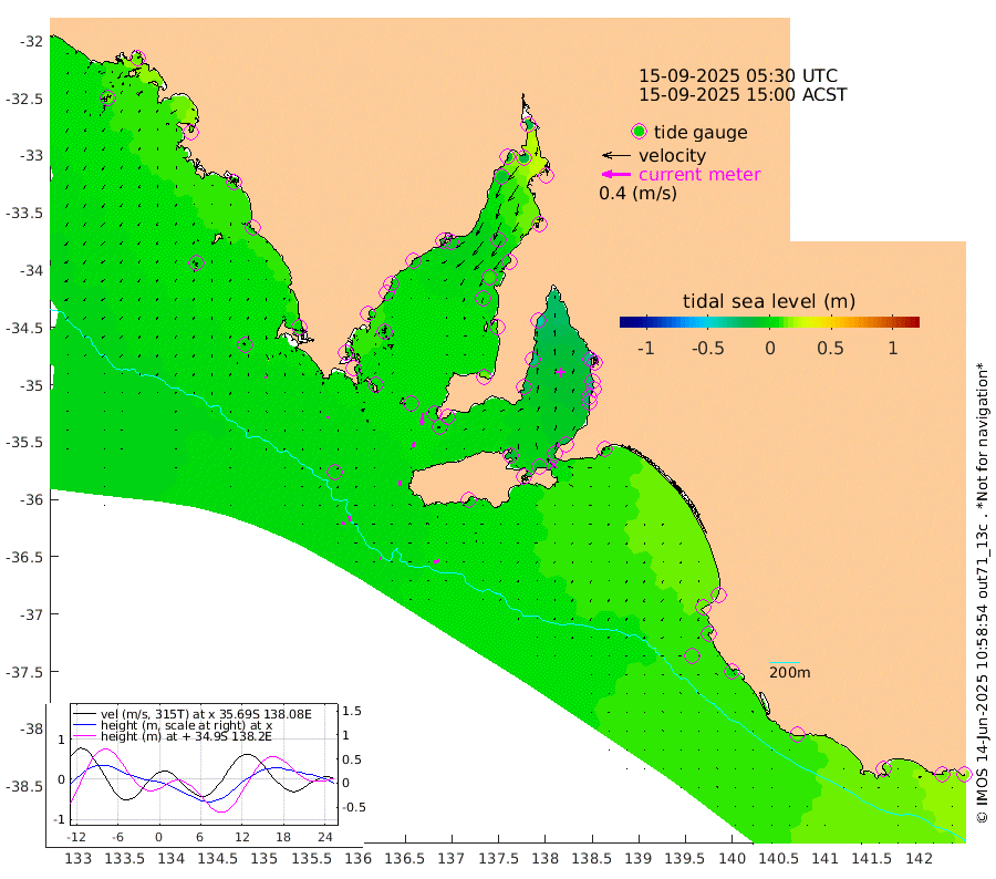 1cm/s -75T +10cm/s rms + 5cm/s 114T. SAM1DS 520m 3cm/s 175T +13cm/s rms + 5cm/s -36T. SAM2CP 100m 7cm/s 169T +21cm/s rms + 18cm/s 142T. SAM3MS 168m 8cm/s -120T +22cm/s rms + 0cm/s -30T. SAM4CY 117m 2cm/s 170T +23cm/s rms + 2cm/s 99T. SAM5CB 94m 8cm/s -162T +8cm/s rms + 3cm/s -172T. SAM6IS 83m 3cm/s 167T +11cm/s rms + 7cm/s 150T. SAM7DS 519m 16cm/s -174T +10cm/s rms + 2cm/s 87T. SAM8SG 47m 8cm/s -174T +20cm/s rms + 12cm/s -168T. NRSKAI 101m 17cm Warrnambool 14cm Port Fairy 12cm Portland 14cm Port Macdonnell 6cm Beachport 8cm Cape Rabelais (off) 11cm Robe 12cm Cape Jaffa 12cm Kingston 5cm Victor Harbor 0cm Vivonne Bay -15cm Kingscote -11cm American River -8cm Penneshaw -11cm Cape Jervis -20cm Second Valley -25cm Port Noarlunga -26cm Port Stanvac -29cm Brighton -28cm Glenelg -32cm Port Adelaide (Outer Harbor) -38cm Angus Inlet (Garden Island) -40cm Ardrossan -33cm Port Vincent -22cm Port Giles 4cm Stenhouse Bay 6cm Althorpe Island 7cm Pondalowie Bay 12cm Point Turton 9cm Port Victoria 6cm Cape Elizabeth 9cm Tiparra Reef Light 5cm Wallaroo -2cm Middle Bank 33cm Port Broughton -6cm Port Pirie -16cm Red Cliff Point (Beacon 5) -17cm Port Bonython -13cm Whyalla -9cm Western Shoal Beacon 4cm Franklin Harbor -2cm Franklin Harbor Entrance Beacon -1cm Arno Bay 3cm Port Neill 2cm Cape Hardy 2cm Tumby Bay 3cm Reevesby Island 4cm Port Lincoln 2cm Taylors Landing 7cm Whalers Bay 4cm Wedge Island Mooring 0cm Shelf Edge Mooring 7cm Coffin Bay Entrance Beacon 1cm Greenly Island 6cm Elliston 2cm Pearson Island 11cm Venus Bay 15cm Blanche Port (Streaky Bay) 12cm Thevenard 15cm St Francis Island