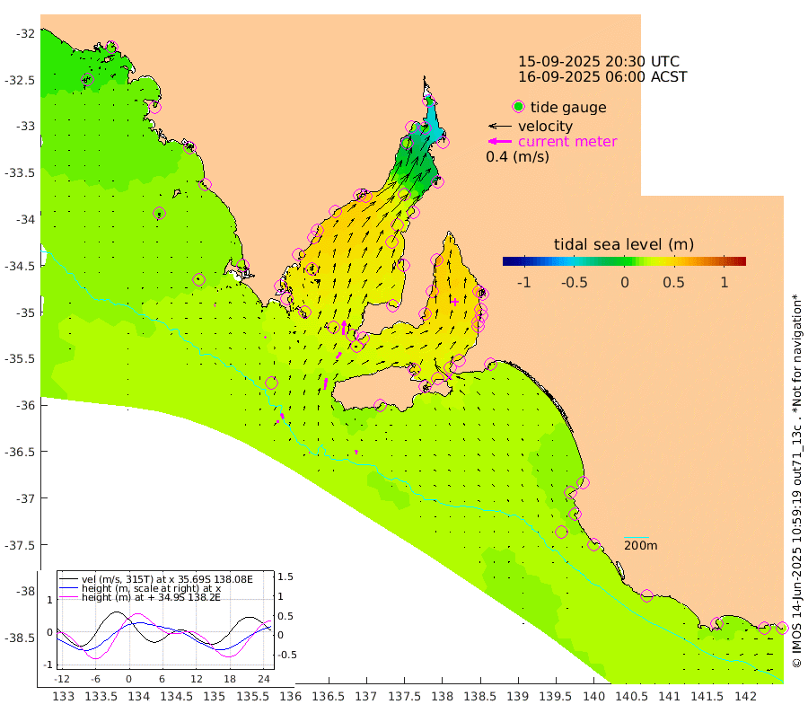 1cm/s 52T +10cm/s rms + 5cm/s 114T. SAM1DS 520m 3cm/s -43T +13cm/s rms + 5cm/s -36T. SAM2CP 100m 9cm/s -21T +21cm/s rms + 18cm/s 142T. SAM3MS 168m 6cm/s -3T +22cm/s rms + 0cm/s -30T. SAM4CY 117m 2cm/s -108T +23cm/s rms + 2cm/s 99T. SAM5CB 94m 13cm/s 37T +8cm/s rms + 3cm/s -172T. SAM6IS 83m 4cm/s -12T +11cm/s rms + 7cm/s 150T. SAM7DS 519m 25cm/s 4T +10cm/s rms + 2cm/s 87T. SAM8SG 47m 19cm/s 8T +20cm/s rms + 12cm/s -168T. NRSKAI 101m 21cm Warrnambool 19cm Port Fairy 21cm Portland 20cm Port Macdonnell 22cm Beachport 20cm Cape Rabelais (off) 20cm Robe 20cm Cape Jaffa 19cm Kingston 25cm Victor Harbor 20cm Vivonne Bay 44cm Kingscote 37cm American River 44cm Penneshaw 37cm Cape Jervis 45cm Second Valley 52cm Port Noarlunga 54cm Port Stanvac 54cm Brighton 56cm Glenelg 60cm Port Adelaide (Outer Harbor) 47cm Angus Inlet (Garden Island) 70cm Ardrossan 62cm Port Vincent 60cm Port Giles 31cm Stenhouse Bay 29cm Althorpe Island 24cm Pondalowie Bay 37cm Point Turton 36cm Port Victoria 40cm Cape Elizabeth 37cm Tiparra Reef Light 30cm Wallaroo 37cm Middle Bank -24cm Port Broughton -2cm Port Pirie -2cm Red Cliff Point (Beacon 5) 10cm Port Bonython 17cm Whyalla 17cm Western Shoal Beacon 38cm Franklin Harbor 56cm Franklin Harbor Entrance Beacon 52cm Arno Bay 55cm Port Neill 49cm Cape Hardy 47cm Tumby Bay 40cm Reevesby Island 41cm Port Lincoln 33cm Taylors Landing 34cm Whalers Bay 31cm Wedge Island Mooring 22cm Shelf Edge Mooring 20cm Coffin Bay Entrance Beacon 20cm Greenly Island 19cm Elliston 14cm Pearson Island 14cm Venus Bay 16cm Blanche Port (Streaky Bay) 15cm Thevenard 8cm St Francis Island
