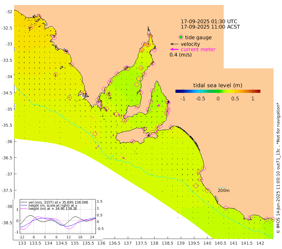1cm/s -82T +10cm/s rms + 5cm/s 114T. SAM1DS 520m 3cm/s -83T +13cm/s rms + 5cm/s -36T. SAM2CP 100m 6cm/s -77T +21cm/s rms + 18cm/s 142T. SAM3MS 168m 10cm/s -56T +22cm/s rms + 0cm/s -30T. SAM4CY 117m 2cm/s -26T +23cm/s rms + 2cm/s 99T. SAM5CB 94m 3cm/s -37T +8cm/s rms + 3cm/s -172T. SAM6IS 83m 3cm/s -84T +11cm/s rms + 7cm/s 150T. SAM7DS 519m 15cm/s -18T +10cm/s rms + 2cm/s 87T. SAM8SG 47m 7cm/s 1T +20cm/s rms + 12cm/s -168T. NRSKAI 101m 26cm Warrnambool 27cm Port Fairy 29cm Portland 30cm Port Macdonnell 30cm Beachport 32cm Cape Rabelais (off) 30cm Robe 36cm Cape Jaffa 32cm Kingston 35cm Victor Harbor 29cm Vivonne Bay 30cm Kingscote 32cm American River 30cm Penneshaw 29cm Cape Jervis 29cm Second Valley 25cm Port Noarlunga 24cm Port Stanvac 25cm Brighton 25cm Glenelg 23cm Port Adelaide (Outer Harbor) 26cm Angus Inlet (Garden Island) 20cm Ardrossan 30cm Port Vincent 22cm Port Giles 27cm Stenhouse Bay 33cm Althorpe Island 30cm Pondalowie Bay 31cm Point Turton 34cm Port Victoria 37cm Cape Elizabeth 38cm Tiparra Reef Light 47cm Wallaroo 50cm Middle Bank 39cm Port Broughton 73cm Port Pirie 74cm Red Cliff Point (Beacon 5) 66cm Port Bonython 67cm Whyalla 64cm Western Shoal Beacon 38cm Franklin Harbor 40cm Franklin Harbor Entrance Beacon 37cm Arno Bay 35cm Port Neill 37cm Cape Hardy 38cm Tumby Bay 38cm Reevesby Island 35cm Port Lincoln 35cm Taylors Landing 34cm Whalers Bay 36cm Wedge Island Mooring 35cm Shelf Edge Mooring 39cm Coffin Bay Entrance Beacon 35cm Greenly Island 40cm Elliston 39cm Pearson Island 32cm Venus Bay 48cm Blanche Port (Streaky Bay) 46cm Thevenard 40cm St Francis Island