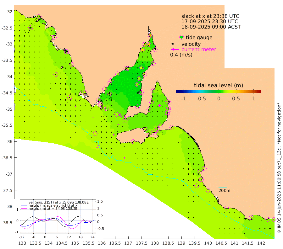 0cm/s -35T +10cm/s rms + 5cm/s 114T. SAM1DS 520m 2cm/s -29T +13cm/s rms + 5cm/s -36T. SAM2CP 100m 7cm/s -42T +21cm/s rms + 18cm/s 142T. SAM3MS 168m 8cm/s -20T +22cm/s rms + 0cm/s -30T. SAM4CY 117m 3cm/s -8T +23cm/s rms + 2cm/s 99T. SAM5CB 94m 6cm/s 21T +8cm/s rms + 3cm/s -172T. SAM6IS 83m 4cm/s -44T +11cm/s rms + 7cm/s 150T. SAM7DS 519m 17cm/s -5T +10cm/s rms + 2cm/s 87T. SAM8SG 47m 11cm/s 4T +20cm/s rms + 12cm/s -168T. NRSKAI 101m 18cm Warrnambool 18cm Port Fairy 20cm Portland 18cm Port Macdonnell 23cm Beachport 22cm Cape Rabelais (off) 20cm Robe 22cm Cape Jaffa 21cm Kingston 24cm Victor Harbor 23cm Vivonne Bay 20cm Kingscote 20cm American River 21cm Penneshaw 19cm Cape Jervis 21cm Second Valley 15cm Port Noarlunga 15cm Port Stanvac 17cm Brighton 15cm Glenelg 15cm Port Adelaide (Outer Harbor) 20cm Angus Inlet (Garden Island) 12cm Ardrossan 17cm Port Vincent 13cm Port Giles 15cm Stenhouse Bay 18cm Althorpe Island 15cm Pondalowie Bay 10cm Point Turton 11cm Port Victoria 17cm Cape Elizabeth 17cm Tiparra Reef Light 24cm Wallaroo 30cm Middle Bank 11cm Port Broughton 56cm Port Pirie 65cm Red Cliff Point (Beacon 5) 53cm Port Bonython 52cm Whyalla 45cm Western Shoal Beacon 20cm Franklin Harbor 21cm Franklin Harbor Entrance Beacon 17cm Arno Bay 16cm Port Neill 18cm Cape Hardy 18cm Tumby Bay 16cm Reevesby Island 17cm Port Lincoln 21cm Taylors Landing 13cm Whalers Bay 20cm Wedge Island Mooring 25cm Shelf Edge Mooring 21cm Coffin Bay Entrance Beacon 23cm Greenly Island 22cm Elliston 22cm Pearson Island 13cm Venus Bay 18cm Blanche Port (Streaky Bay) 17cm Thevenard 16cm St Francis Island