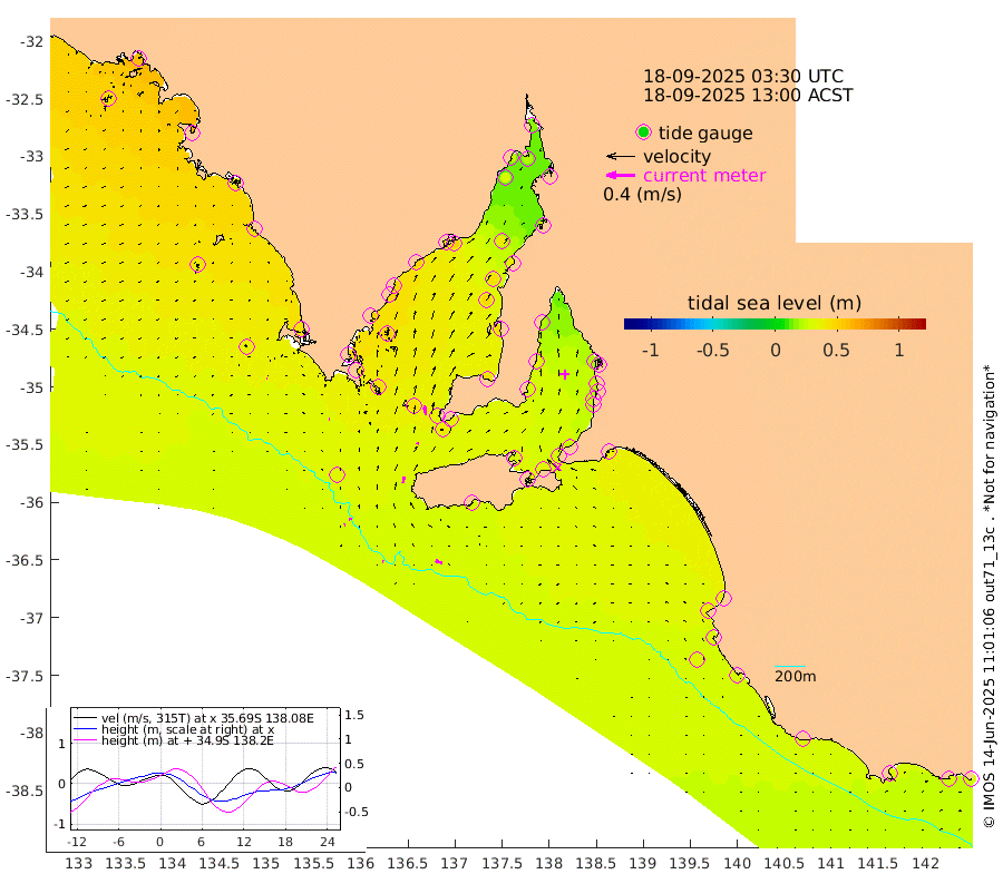 1cm/s -77T +10cm/s rms + 5cm/s 114T. SAM1DS 520m 2cm/s -98T +13cm/s rms + 5cm/s -36T. SAM2CP 100m 4cm/s -85T +21cm/s rms + 18cm/s 142T. SAM3MS 168m 10cm/s -72T +22cm/s rms + 0cm/s -30T. SAM4CY 117m 1cm/s -91T +23cm/s rms + 2cm/s 99T. SAM5CB 94m 2cm/s 19T +8cm/s rms + 3cm/s -172T. SAM6IS 83m 1cm/s -111T +11cm/s rms + 7cm/s 150T. SAM7DS 519m 13cm/s -7T +10cm/s rms + 2cm/s 87T. SAM8SG 47m 8cm/s 8T +20cm/s rms + 12cm/s -168T. NRSKAI 101m 29cm Warrnambool 29cm Port Fairy 30cm Portland 33cm Port Macdonnell 30cm Beachport 32cm Cape Rabelais (off) 32cm Robe 38cm Cape Jaffa 35cm Kingston 36cm Victor Harbor 28cm Vivonne Bay 30cm Kingscote 30cm American River 32cm Penneshaw 28cm Cape Jervis 24cm Second Valley 24cm Port Noarlunga 24cm Port Stanvac 22cm Brighton 25cm Glenelg 21cm Port Adelaide (Outer Harbor) 11cm Angus Inlet (Garden Island) 20cm Ardrossan 34cm Port Vincent 28cm Port Giles 35cm Stenhouse Bay 38cm Althorpe Island 36cm Pondalowie Bay 44cm Point Turton 48cm Port Victoria 47cm Cape Elizabeth 43cm Tiparra Reef Light 41cm Wallaroo 41cm Middle Bank 28cm Port Broughton 23cm Port Pirie 16cm Red Cliff Point (Beacon 5) 21cm Port Bonython 25cm Whyalla 29cm Western Shoal Beacon 40cm Franklin Harbor 50cm Franklin Harbor Entrance Beacon 51cm Arno Bay 52cm Port Neill 51cm Cape Hardy 52cm Tumby Bay 51cm Reevesby Island 49cm Port Lincoln 43cm Taylors Landing 44cm Whalers Bay 42cm Wedge Island Mooring 33cm Shelf Edge Mooring 45cm Coffin Bay Entrance Beacon 36cm Greenly Island 45cm Elliston 41cm Pearson Island 39cm Venus Bay 62cm Blanche Port (Streaky Bay) 59cm Thevenard 45cm St Francis Island