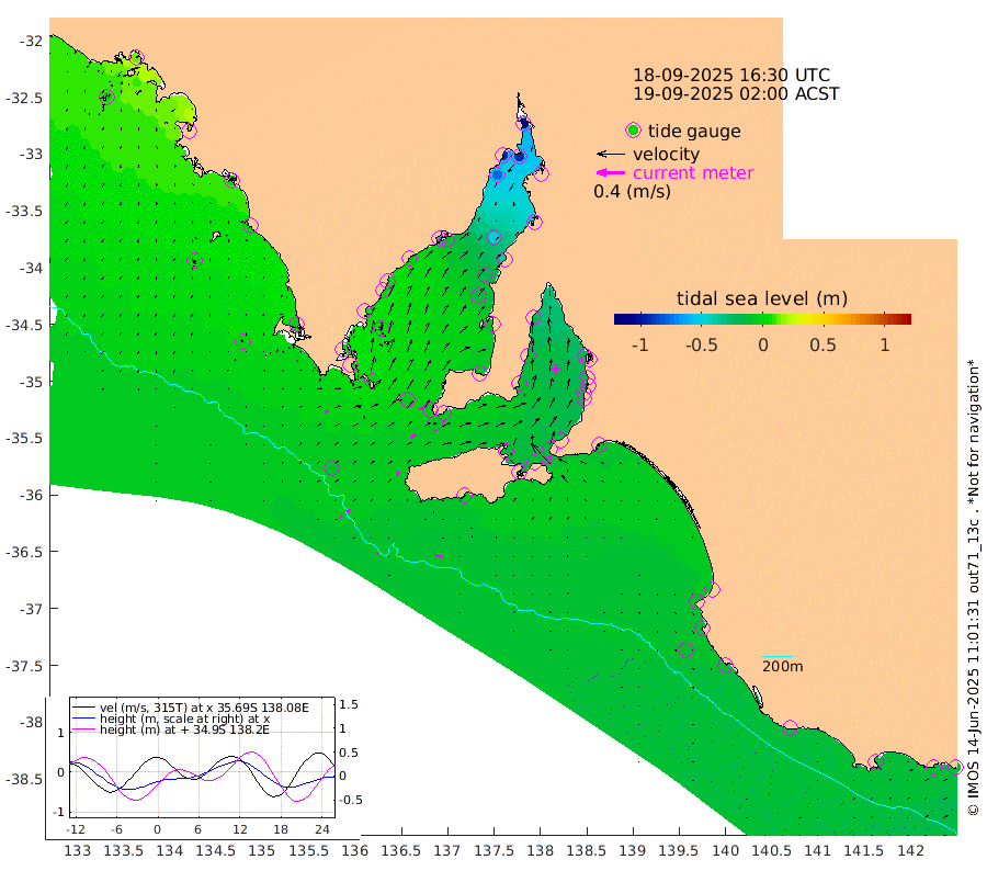 1cm/s 111T +10cm/s rms + 5cm/s 114T. SAM1DS 520m 5cm/s 58T +13cm/s rms + 5cm/s -36T. SAM2CP 100m 6cm/s 71T +21cm/s rms + 18cm/s 142T. SAM3MS 168m 10cm/s 105T +22cm/s rms + 0cm/s -30T. SAM4CY 117m 1cm/s -120T +23cm/s rms + 2cm/s 99T. SAM5CB 94m 9cm/s 54T +8cm/s rms + 3cm/s -172T. SAM6IS 83m 3cm/s 77T +11cm/s rms + 7cm/s 150T. SAM7DS 519m 12cm/s 61T +10cm/s rms + 2cm/s 87T. SAM8SG 47m 6cm/s 24T +20cm/s rms + 12cm/s -168T. NRSKAI 101m -15cm Warrnambool -14cm Port Fairy -15cm Portland -13cm Port Macdonnell -13cm Beachport -12cm Cape Rabelais (off) -12cm Robe -13cm Cape Jaffa -10cm Kingston -10cm Victor Harbor -6cm Vivonne Bay -17cm Kingscote -19cm American River -11cm Penneshaw -16cm Cape Jervis -23cm Second Valley -18cm Port Noarlunga -18cm Port Stanvac -21cm Brighton -18cm Glenelg -20cm Port Adelaide (Outer Harbor) -38cm Angus Inlet (Garden Island) -17cm Ardrossan -9cm Port Vincent -10cm Port Giles -4cm Stenhouse Bay -8cm Althorpe Island -7cm Pondalowie Bay -10cm Point Turton -10cm Port Victoria -16cm Cape Elizabeth -21cm Tiparra Reef Light -40cm Wallaroo -46cm Middle Bank -53cm Port Broughton -103cm Port Pirie -109cm Red Cliff Point (Beacon 5) -93cm Port Bonython -91cm Whyalla -77cm Western Shoal Beacon -35cm Franklin Harbor -15cm Franklin Harbor Entrance Beacon -4cm Arno Bay 2cm Port Neill 2cm Cape Hardy 4cm Tumby Bay 4cm Reevesby Island 5cm Port Lincoln 1cm Taylors Landing -6cm Whalers Bay -6cm Wedge Island Mooring -9cm Shelf Edge Mooring 0cm Coffin Bay Entrance Beacon -3cm Greenly Island 1cm Elliston 1cm Pearson Island 1cm Venus Bay 13cm Blanche Port (Streaky Bay) 15cm Thevenard 7cm St Francis Island