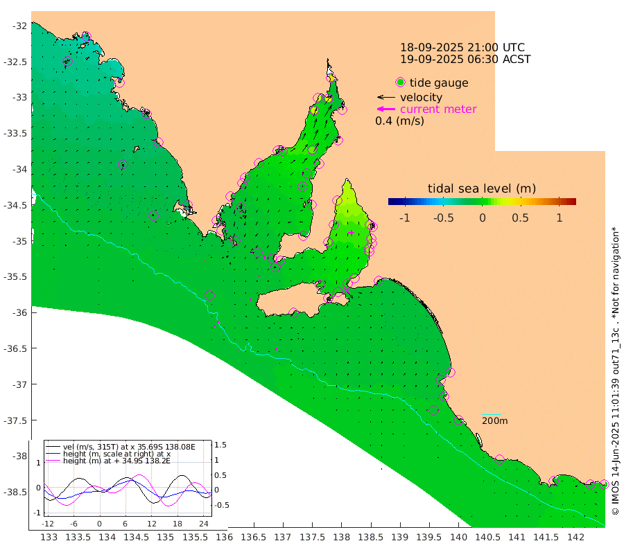 1cm/s 104T +10cm/s rms + 5cm/s 114T. SAM1DS 520m 2cm/s -85T +13cm/s rms + 5cm/s -36T. SAM2CP 100m 5cm/s -22T +21cm/s rms + 18cm/s 142T. SAM3MS 168m 7cm/s 43T +22cm/s rms + 0cm/s -30T. SAM4CY 117m 1cm/s 142T +23cm/s rms + 2cm/s 99T. SAM5CB 94m 2cm/s -19T +8cm/s rms + 3cm/s -172T. SAM6IS 83m 3cm/s -15T +11cm/s rms + 7cm/s 150T. SAM7DS 519m 6cm/s -17T +10cm/s rms + 2cm/s 87T. SAM8SG 47m 4cm/s -5T +20cm/s rms + 12cm/s -168T. NRSKAI 101m -3cm Warrnambool -5cm Port Fairy -5cm Portland -10cm Port Macdonnell -6cm Beachport -8cm Cape Rabelais (off) -9cm Robe -13cm Cape Jaffa -10cm Kingston -8cm Victor Harbor -7cm Vivonne Bay 5cm Kingscote 4cm American River 3cm Penneshaw 6cm Cape Jervis 14cm Second Valley 15cm Port Noarlunga 17cm Port Stanvac 18cm Brighton 18cm Glenelg 22cm Port Adelaide (Outer Harbor) 31cm Angus Inlet (Garden Island) 26cm Ardrossan 7cm Port Vincent 13cm Port Giles -10cm Stenhouse Bay -8cm Althorpe Island -12cm Pondalowie Bay -10cm Point Turton -11cm Port Victoria -6cm Cape Elizabeth 0cm Tiparra Reef Light 5cm Wallaroo 12cm Middle Bank -17cm Port Broughton 28cm Port Pirie 46cm Red Cliff Point (Beacon 5) 33cm Port Bonython 32cm Whyalla 27cm Western Shoal Beacon 6cm Franklin Harbor 4cm Franklin Harbor Entrance Beacon -3cm Arno Bay -3cm Port Neill -8cm Cape Hardy -10cm Tumby Bay -13cm Reevesby Island -14cm Port Lincoln -13cm Taylors Landing -12cm Whalers Bay -12cm Wedge Island Mooring -9cm Shelf Edge Mooring -19cm Coffin Bay Entrance Beacon -14cm Greenly Island -22cm Elliston -23cm Pearson Island -21cm Venus Bay -38cm Blanche Port (Streaky Bay) -37cm Thevenard -29cm St Francis Island