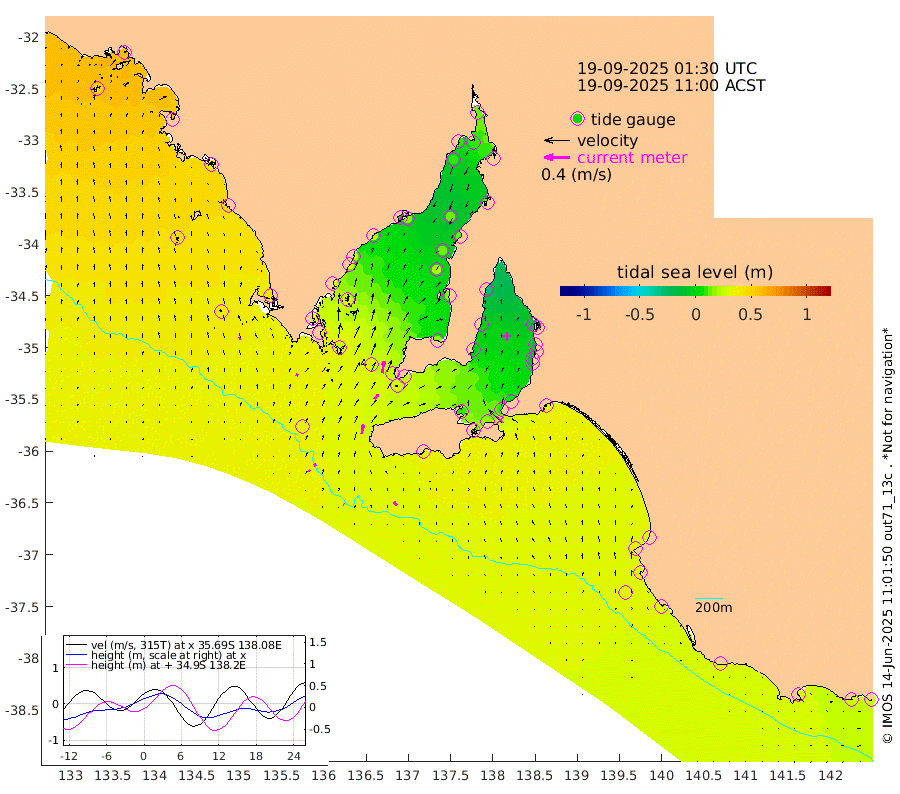 1cm/s -64T +10cm/s rms + 5cm/s 114T. SAM1DS 520m 4cm/s 30T +13cm/s rms + 5cm/s -36T. SAM2CP 100m 4cm/s -31T +21cm/s rms + 18cm/s 142T. SAM3MS 168m 8cm/s -38T +22cm/s rms + 0cm/s -30T. SAM4CY 117m 4cm/s -10T +23cm/s rms + 2cm/s 99T. SAM5CB 94m 9cm/s 34T +8cm/s rms + 3cm/s -172T. SAM6IS 83m 2cm/s -46T +11cm/s rms + 7cm/s 150T. SAM7DS 519m 19cm/s 9T +10cm/s rms + 2cm/s 87T. SAM8SG 47m 14cm/s 9T +20cm/s rms + 12cm/s -168T. NRSKAI 101m 26cm Warrnambool 28cm Port Fairy 30cm Portland 30cm Port Macdonnell 33cm Beachport 34cm Cape Rabelais (off) 32cm Robe 37cm Cape Jaffa 35cm Kingston 36cm Victor Harbor 34cm Vivonne Bay 9cm Kingscote 11cm American River 17cm Penneshaw 10cm Cape Jervis 1cm Second Valley -9cm Port Noarlunga -11cm Port Stanvac -11cm Brighton -12cm Glenelg -18cm Port Adelaide (Outer Harbor) -24cm Angus Inlet (Garden Island) -27cm Ardrossan -1cm Port Vincent -7cm Port Giles 24cm Stenhouse Bay 27cm Althorpe Island 26cm Pondalowie Bay 17cm Point Turton 19cm Port Victoria 21cm Cape Elizabeth 14cm Tiparra Reef Light 13cm Wallaroo 13cm Middle Bank 12cm Port Broughton 15cm Port Pirie 14cm Red Cliff Point (Beacon 5) 11cm Port Bonython 9cm Whyalla 8cm Western Shoal Beacon 7cm Franklin Harbor 18cm Franklin Harbor Entrance Beacon 22cm Arno Bay 25cm Port Neill 29cm Cape Hardy 33cm Tumby Bay 31cm Reevesby Island 34cm Port Lincoln 38cm Taylors Landing 23cm Whalers Bay 33cm Wedge Island Mooring 37cm Shelf Edge Mooring 44cm Coffin Bay Entrance Beacon 39cm Greenly Island 46cm Elliston 46cm Pearson Island 34cm Venus Bay 58cm Blanche Port (Streaky Bay) 57cm Thevenard 48cm St Francis Island