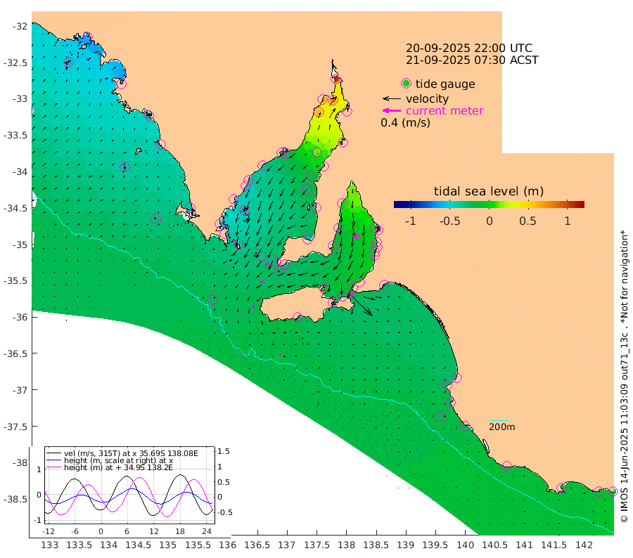 0cm/s 152T +10cm/s rms + 5cm/s 114T. SAM1DS 520m 4cm/s -128T +13cm/s rms + 5cm/s -36T. SAM2CP 100m 3cm/s -85T +21cm/s rms + 18cm/s 142T. SAM3MS 168m 5cm/s 41T +22cm/s rms + 0cm/s -30T. SAM4CY 117m 2cm/s 92T +23cm/s rms + 2cm/s 99T. SAM5CB 94m 9cm/s -121T +8cm/s rms + 3cm/s -172T. SAM6IS 83m 2cm/s -74T +11cm/s rms + 7cm/s 150T. SAM7DS 519m 11cm/s -136T +10cm/s rms + 2cm/s 87T. SAM8SG 47m 9cm/s -159T +20cm/s rms + 12cm/s -168T. NRSKAI 101m -12cm Warrnambool -14cm Port Fairy -14cm Portland -21cm Port Macdonnell -16cm Beachport -17cm Cape Rabelais (off) -19cm Robe -23cm Cape Jaffa -21cm Kingston -20cm Victor Harbor -18cm Vivonne Bay -11cm Kingscote -7cm American River -16cm Penneshaw -6cm Cape Jervis 3cm Second Valley -1cm Port Noarlunga 0cm Port Stanvac 2cm Brighton 1cm Glenelg 5cm Port Adelaide (Outer Harbor) 31cm Angus Inlet (Garden Island) 4cm Ardrossan -22cm Port Vincent -12cm Port Giles -28cm Stenhouse Bay -22cm Althorpe Island -26cm Pondalowie Bay -30cm Point Turton -31cm Port Victoria -26cm Cape Elizabeth -12cm Tiparra Reef Light 7cm Wallaroo 13cm Middle Bank 13cm Port Broughton 81cm Port Pirie 105cm Red Cliff Point (Beacon 5) 73cm Port Bonython 70cm Whyalla 60cm Western Shoal Beacon -3cm Franklin Harbor -21cm Franklin Harbor Entrance Beacon -31cm Arno Bay -36cm Port Neill -37cm Cape Hardy -39cm Tumby Bay -39cm Reevesby Island -42cm Port Lincoln -36cm Taylors Landing -30cm Whalers Bay -30cm Wedge Island Mooring -20cm Shelf Edge Mooring -34cm Coffin Bay Entrance Beacon -26cm Greenly Island -36cm Elliston -35cm Pearson Island -33cm Venus Bay -59cm Blanche Port (Streaky Bay) -57cm Thevenard -40cm St Francis Island