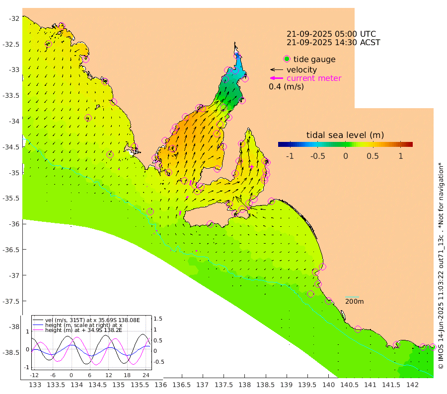1cm/s -58T +10cm/s rms + 5cm/s 114T. SAM1DS 520m 1cm/s -46T +13cm/s rms + 5cm/s -36T. SAM2CP 100m 3cm/s 1T +21cm/s rms + 18cm/s 142T. SAM3MS 168m 5cm/s -89T +22cm/s rms + 0cm/s -30T. SAM4CY 117m 3cm/s -145T +23cm/s rms + 2cm/s 99T. SAM5CB 94m 8cm/s 50T +8cm/s rms + 3cm/s -172T. SAM6IS 83m 1cm/s 35T +11cm/s rms + 7cm/s 150T. SAM7DS 519m 15cm/s 15T +10cm/s rms + 2cm/s 87T. SAM8SG 47m 13cm/s 12T +20cm/s rms + 12cm/s -168T. NRSKAI 101m 11cm Warrnambool 12cm Port Fairy 12cm Portland 19cm Port Macdonnell 14cm Beachport 16cm Cape Rabelais (off) 17cm Robe 21cm Cape Jaffa 21cm Kingston 22cm Victor Harbor 14cm Vivonne Bay 38cm Kingscote 31cm American River 38cm Penneshaw 29cm Cape Jervis 29cm Second Valley 41cm Port Noarlunga 43cm Port Stanvac 40cm Brighton 46cm Glenelg 44cm Port Adelaide (Outer Harbor) 15cm Angus Inlet (Garden Island) 55cm Ardrossan 70cm Port Vincent 55cm Port Giles 35cm Stenhouse Bay 32cm Althorpe Island 31cm Pondalowie Bay 47cm Point Turton 50cm Port Victoria 50cm Cape Elizabeth 36cm Tiparra Reef Light 17cm Wallaroo 16cm Middle Bank -13cm Port Broughton -66cm Port Pirie -77cm Red Cliff Point (Beacon 5) -50cm Port Bonython -44cm Whyalla -34cm Western Shoal Beacon 31cm Franklin Harbor 53cm Franklin Harbor Entrance Beacon 59cm Arno Bay 66cm Port Neill 61cm Cape Hardy 60cm Tumby Bay 53cm Reevesby Island 53cm Port Lincoln 41cm Taylors Landing 44cm Whalers Bay 37cm Wedge Island Mooring 18cm Shelf Edge Mooring 32cm Coffin Bay Entrance Beacon 21cm Greenly Island 31cm Elliston 27cm Pearson Island 30cm Venus Bay 51cm Blanche Port (Streaky Bay) 47cm Thevenard 25cm St Francis Island