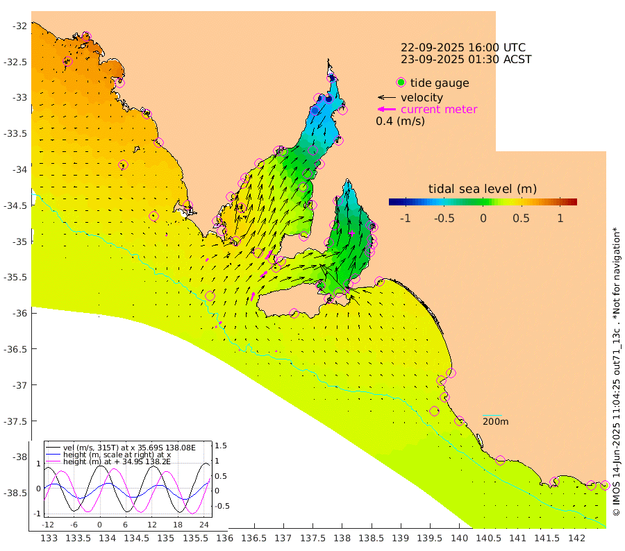 1cm/s 89T +10cm/s rms + 5cm/s 114T. SAM1DS 520m 8cm/s 46T +13cm/s rms + 5cm/s -36T. SAM2CP 100m 6cm/s 58T +21cm/s rms + 18cm/s 142T. SAM3MS 168m 2cm/s 137T +22cm/s rms + 0cm/s -30T. SAM4CY 117m 3cm/s -47T +23cm/s rms + 2cm/s 99T. SAM5CB 94m 20cm/s 52T +8cm/s rms + 3cm/s -172T. SAM6IS 83m 3cm/s 65T +11cm/s rms + 7cm/s 150T. SAM7DS 519m 24cm/s 37T +10cm/s rms + 2cm/s 87T. SAM8SG 47m 19cm/s 17T +20cm/s rms + 12cm/s -168T. NRSKAI 101m 25cm Warrnambool 26cm Port Fairy 27cm Portland 31cm Port Macdonnell 28cm Beachport 29cm Cape Rabelais (off) 31cm Robe 34cm Cape Jaffa 32cm Kingston 33cm Victor Harbor 32cm Vivonne Bay 2cm Kingscote -1cm American River 16cm Penneshaw 0cm Cape Jervis -15cm Second Valley -17cm Port Noarlunga -19cm Port Stanvac -23cm Brighton -23cm Glenelg -30cm Port Adelaide (Outer Harbor) -63cm Angus Inlet (Garden Island) -34cm Ardrossan 0cm Port Vincent -2cm Port Giles 35cm Stenhouse Bay 30cm Althorpe Island 31cm Pondalowie Bay 29cm Point Turton 27cm Port Victoria 19cm Cape Elizabeth 8cm Tiparra Reef Light -20cm Wallaroo -28cm Middle Bank -37cm Port Broughton -109cm Port Pirie -134cm Red Cliff Point (Beacon 5) -104cm Port Bonython -98cm Whyalla -82cm Western Shoal Beacon -10cm Franklin Harbor 19cm Franklin Harbor Entrance Beacon 33cm Arno Bay 42cm Port Neill 43cm Cape Hardy 48cm Tumby Bay 49cm Reevesby Island 54cm Port Lincoln 48cm Taylors Landing 33cm Whalers Bay 38cm Wedge Island Mooring 32cm Shelf Edge Mooring 48cm Coffin Bay Entrance Beacon 40cm Greenly Island 51cm Elliston 48cm Pearson Island 42cm Venus Bay 78cm Blanche Port (Streaky Bay) 77cm Thevenard 65cm St Francis Island