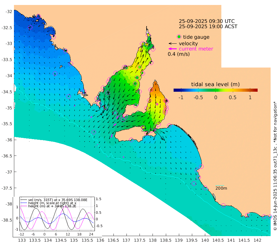 1cm/s 114T +10cm/s rms + 5cm/s 114T. SAM1DS 520m 7cm/s -129T +13cm/s rms + 5cm/s -36T. SAM2CP 100m 2cm/s -100T +21cm/s rms + 18cm/s 142T. SAM3MS 168m 5cm/s 130T +22cm/s rms + 0cm/s -30T. SAM4CY 117m 4cm/s 172T +23cm/s rms + 2cm/s 99T. SAM5CB 94m 14cm/s -128T +8cm/s rms + 3cm/s -172T. SAM6IS 83m 1cm/s -76T +11cm/s rms + 7cm/s 150T. SAM7DS 519m 17cm/s -146T +10cm/s rms + 2cm/s 87T. SAM8SG 47m 15cm/s -164T +20cm/s rms + 12cm/s -168T. NRSKAI 101m -47cm Warrnambool -45cm Port Fairy -46cm Portland -45cm Port Macdonnell -43cm Beachport -45cm Cape Rabelais (off) -46cm Robe -50cm Cape Jaffa -50cm Kingston -45cm Victor Harbor -44cm Vivonne Bay 20cm Kingscote 15cm American River -2cm Penneshaw 14cm Cape Jervis 36cm Second Valley 56cm Port Noarlunga 59cm Port Stanvac 63cm Brighton 64cm Glenelg 77cm Port Adelaide (Outer Harbor) 92cm Angus Inlet (Garden Island) 99cm Ardrossan 63cm Port Vincent 48cm Port Giles -28cm Stenhouse Bay -32cm Althorpe Island -30cm Pondalowie Bay -20cm Point Turton -16cm Port Victoria -10cm Cape Elizabeth -10cm Tiparra Reef Light 5cm Wallaroo 13cm Middle Bank -6cm Port Broughton 28cm Port Pirie 41cm Red Cliff Point (Beacon 5) 43cm Port Bonython 40cm Whyalla 30cm Western Shoal Beacon 10cm Franklin Harbor -7cm Franklin Harbor Entrance Beacon -16cm Arno Bay -25cm Port Neill -26cm Cape Hardy -33cm Tumby Bay -36cm Reevesby Island -44cm Port Lincoln -46cm Taylors Landing -25cm Whalers Bay -38cm Wedge Island Mooring -43cm Shelf Edge Mooring -58cm Coffin Bay Entrance Beacon -50cm Greenly Island -60cm Elliston -54cm Pearson Island -48cm Venus Bay -83cm Blanche Port (Streaky Bay) -83cm Thevenard -75cm St Francis Island