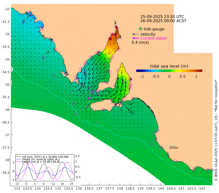 1cm/s -136T +10cm/s rms + 5cm/s 114T. SAM1DS 520m 9cm/s -126T +13cm/s rms + 5cm/s -36T. SAM2CP 100m 9cm/s -121T +21cm/s rms + 18cm/s 142T. SAM3MS 168m 5cm/s -63T +22cm/s rms + 0cm/s -30T. SAM4CY 117m 2cm/s 118T +23cm/s rms + 2cm/s 99T. SAM5CB 94m 23cm/s -122T +8cm/s rms + 3cm/s -172T. SAM6IS 83m 4cm/s -117T +11cm/s rms + 7cm/s 150T. SAM7DS 519m 24cm/s -133T +10cm/s rms + 2cm/s 87T. SAM8SG 47m 20cm/s -163T +20cm/s rms + 12cm/s -168T. NRSKAI 101m -11cm Warrnambool -11cm Port Fairy -11cm Portland -15cm Port Macdonnell -13cm Beachport -15cm Cape Rabelais (off) -15cm Robe -14cm Cape Jaffa -16cm Kingston -16cm Victor Harbor -18cm Vivonne Bay 4cm Kingscote 11cm American River -8cm Penneshaw 8cm Cape Jervis 22cm Second Valley 19cm Port Noarlunga 19cm Port Stanvac 23cm Brighton 20cm Glenelg 28cm Port Adelaide (Outer Harbor) 64cm Angus Inlet (Garden Island) 26cm Ardrossan -1cm Port Vincent 0cm Port Giles -25cm Stenhouse Bay -17cm Althorpe Island -19cm Pondalowie Bay -17cm Point Turton -15cm Port Victoria -6cm Cape Elizabeth 9cm Tiparra Reef Light 44cm Wallaroo 51cm Middle Bank 62cm Port Broughton 160cm Port Pirie 182cm Red Cliff Point (Beacon 5) 138cm Port Bonython 139cm Whyalla 124cm Western Shoal Beacon 32cm Franklin Harbor -5cm Franklin Harbor Entrance Beacon -24cm Arno Bay -40cm Port Neill -34cm Cape Hardy -38cm Tumby Bay -32cm Reevesby Island -42cm Port Lincoln -36cm Taylors Landing -20cm Whalers Bay -24cm Wedge Island Mooring -16cm Shelf Edge Mooring -30cm Coffin Bay Entrance Beacon -23cm Greenly Island -31cm Elliston -33cm Pearson Island -25cm Venus Bay -54cm Blanche Port (Streaky Bay) -53cm Thevenard -43cm St Francis Island