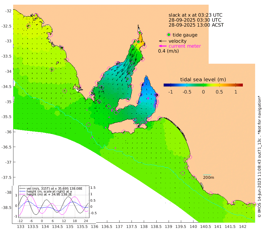 1cm/s -81T +10cm/s rms + 5cm/s 114T. SAM1DS 520m 3cm/s 93T +13cm/s rms + 5cm/s -36T. SAM2CP 100m 7cm/s 171T +21cm/s rms + 18cm/s 142T. SAM3MS 168m 6cm/s -106T +22cm/s rms + 0cm/s -30T. SAM4CY 117m 2cm/s 34T +23cm/s rms + 2cm/s 99T. SAM5CB 94m 6cm/s -145T +8cm/s rms + 3cm/s -172T. SAM6IS 83m 4cm/s 175T +11cm/s rms + 7cm/s 150T. SAM7DS 519m 12cm/s 176T +10cm/s rms + 2cm/s 87T. SAM8SG 47m 7cm/s -175T +20cm/s rms + 12cm/s -168T. NRSKAI 101m 19cm Warrnambool 17cm Port Fairy 16cm Portland 15cm Port Macdonnell 13cm Beachport 14cm Cape Rabelais (off) 16cm Robe 19cm Cape Jaffa 18cm Kingston 9cm Victor Harbor 10cm Vivonne Bay -43cm Kingscote -34cm American River -30cm Penneshaw -33cm Cape Jervis -50cm Second Valley -70cm Port Noarlunga -72cm Port Stanvac -75cm Brighton -76cm Glenelg -86cm Port Adelaide (Outer Harbor) -81cm Angus Inlet (Garden Island) -109cm Ardrossan -89cm Port Vincent -72cm Port Giles -7cm Stenhouse Bay -3cm Althorpe Island 1cm Pondalowie Bay -11cm Point Turton -11cm Port Victoria -16cm Cape Elizabeth -14cm Tiparra Reef Light -11cm Wallaroo -19cm Middle Bank 37cm Port Broughton 16cm Port Pirie 10cm Red Cliff Point (Beacon 5) -8cm Port Bonython -8cm Whyalla -7cm Western Shoal Beacon -20cm Franklin Harbor -30cm Franklin Harbor Entrance Beacon -26cm Arno Bay -28cm Port Neill -22cm Cape Hardy -17cm Tumby Bay -12cm Reevesby Island -7cm Port Lincoln 0cm Taylors Landing -9cm Whalers Bay 0cm Wedge Island Mooring 9cm Shelf Edge Mooring 16cm Coffin Bay Entrance Beacon 12cm Greenly Island 18cm Elliston 14cm Pearson Island 14cm Venus Bay 27cm Blanche Port (Streaky Bay) 27cm Thevenard 22cm St Francis Island