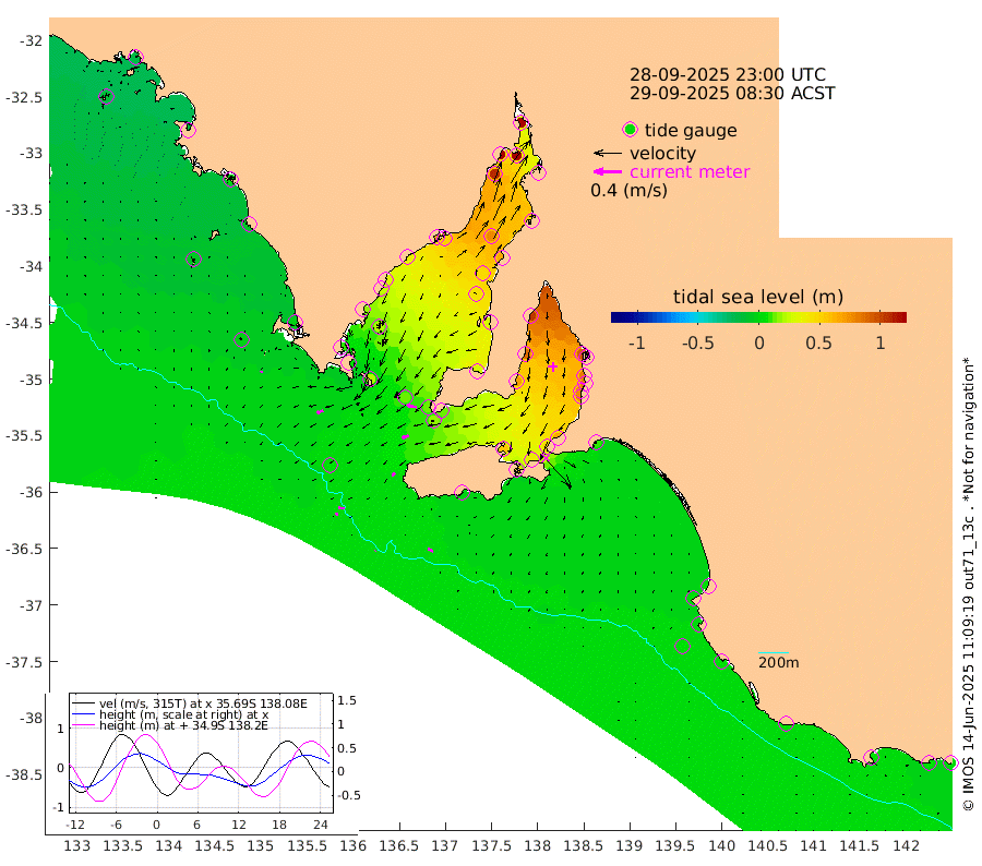1cm/s -127T +10cm/s rms + 5cm/s 114T. SAM1DS 520m 9cm/s -114T +13cm/s rms + 5cm/s -36T. SAM2CP 100m 8cm/s -84T +21cm/s rms + 18cm/s 142T. SAM3MS 168m 8cm/s -61T +22cm/s rms + 0cm/s -30T. SAM4CY 117m 2cm/s -147T +23cm/s rms + 2cm/s 99T. SAM5CB 94m 10cm/s -112T +8cm/s rms + 3cm/s -172T. SAM6IS 83m 3cm/s -81T +11cm/s rms + 7cm/s 150T. SAM7DS 519m 14cm/s -81T +10cm/s rms + 2cm/s 87T. SAM8SG 47m 5cm/s -142T +20cm/s rms + 12cm/s -168T. NRSKAI 101m 3cm Warrnambool 4cm Port Fairy 4cm Portland 5cm Port Macdonnell 5cm Beachport 4cm Cape Rabelais (off) 3cm Robe 5cm Cape Jaffa 4cm Kingston 8cm Victor Harbor 0cm Vivonne Bay 53cm Kingscote 52cm American River 38cm Penneshaw 46cm Cape Jervis 65cm Second Valley 75cm Port Noarlunga 78cm Port Stanvac 80cm Brighton 81cm Glenelg 90cm Port Adelaide (Outer Harbor) 103cm Angus Inlet (Garden Island) 103cm Ardrossan 89cm Port Vincent 68cm Port Giles 12cm Stenhouse Bay 18cm Althorpe Island 12cm Pondalowie Bay 28cm Point Turton 30cm Port Victoria 41cm Cape Elizabeth 47cm Tiparra Reef Light 66cm Wallaroo 75cm Middle Bank 42cm Port Broughton 115cm Port Pirie 130cm Red Cliff Point (Beacon 5) 117cm Port Bonython 117cm Whyalla 107cm Western Shoal Beacon 66cm Franklin Harbor 50cm Franklin Harbor Entrance Beacon 35cm Arno Bay 30cm Port Neill 25cm Cape Hardy 18cm Tumby Bay 20cm Reevesby Island 9cm Port Lincoln 4cm Taylors Landing 22cm Whalers Bay 12cm Wedge Island Mooring 5cm Shelf Edge Mooring 0cm Coffin Bay Entrance Beacon -1cm Greenly Island -5cm Elliston -5cm Pearson Island 1cm Venus Bay -14cm Blanche Port (Streaky Bay) -17cm Thevenard -13cm St Francis Island