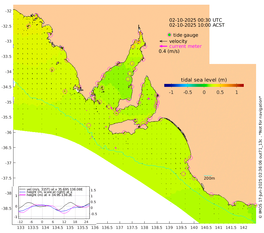 1cm/s -81T +10cm/s rms + 5cm/s 114T. SAM1DS 520m 2cm/s -97T +13cm/s rms + 5cm/s -36T. SAM2CP 100m 4cm/s -74T +21cm/s rms + 18cm/s 142T. SAM3MS 168m 9cm/s -57T +22cm/s rms + 0cm/s -30T. SAM4CY 117m 2cm/s -29T +23cm/s rms + 2cm/s 99T. SAM5CB 94m 2cm/s -24T +8cm/s rms + 3cm/s -172T. SAM6IS 83m 2cm/s -78T +11cm/s rms + 7cm/s 150T. SAM7DS 519m 13cm/s -20T +10cm/s rms + 2cm/s 87T. SAM8SG 47m 6cm/s 1T +20cm/s rms + 12cm/s -168T. NRSKAI 101m 22cm Warrnambool 23cm Port Fairy 24cm Portland 25cm Port Macdonnell 25cm Beachport 28cm Cape Rabelais (off) 25cm Robe 29cm Cape Jaffa 28cm Kingston 29cm Victor Harbor 25cm Vivonne Bay 25cm Kingscote 29cm American River 27cm Penneshaw 25cm Cape Jervis 25cm Second Valley 22cm Port Noarlunga 22cm Port Stanvac 23cm Brighton 23cm Glenelg 21cm Port Adelaide (Outer Harbor) 24cm Angus Inlet (Garden Island) 20cm Ardrossan 30cm Port Vincent 20cm Port Giles 23cm Stenhouse Bay 29cm Althorpe Island 25cm Pondalowie Bay 24cm Point Turton 26cm Port Victoria 29cm Cape Elizabeth 31cm Tiparra Reef Light 37cm Wallaroo 39cm Middle Bank 34cm Port Broughton 60cm Port Pirie 64cm Red Cliff Point (Beacon 5) 59cm Port Bonython 55cm Whyalla 51cm Western Shoal Beacon 27cm Franklin Harbor 29cm Franklin Harbor Entrance Beacon 29cm Arno Bay 32cm Port Neill 31cm Cape Hardy 31cm Tumby Bay 30cm Reevesby Island 28cm Port Lincoln 28cm Taylors Landing 27cm Whalers Bay 29cm Wedge Island Mooring 29cm Shelf Edge Mooring 32cm Coffin Bay Entrance Beacon 28cm Greenly Island 32cm Elliston 35cm Pearson Island 26cm Venus Bay 38cm Blanche Port (Streaky Bay) 36cm Thevenard 40cm St Francis Island
