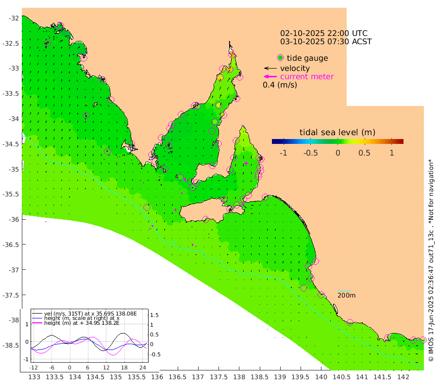 0cm/s -43T +10cm/s rms + 5cm/s 114T. SAM1DS 520m 2cm/s -61T +13cm/s rms + 5cm/s -36T. SAM2CP 100m 5cm/s -43T +21cm/s rms + 18cm/s 142T. SAM3MS 168m 7cm/s -15T +22cm/s rms + 0cm/s -30T. SAM4CY 117m 2cm/s 2T +23cm/s rms + 2cm/s 99T. SAM5CB 94m 4cm/s 0T +8cm/s rms + 3cm/s -172T. SAM6IS 83m 3cm/s -42T +11cm/s rms + 7cm/s 150T. SAM7DS 519m 11cm/s -13T +10cm/s rms + 2cm/s 87T. SAM8SG 47m 7cm/s 0T +20cm/s rms + 12cm/s -168T. NRSKAI 101m 12cm Warrnambool 11cm Port Fairy 12cm Portland 9cm Port Macdonnell 13cm Beachport 13cm Cape Rabelais (off) 10cm Robe 11cm Cape Jaffa 10cm Kingston 13cm Victor Harbor 12cm Vivonne Bay 12cm Kingscote 13cm American River 13cm Penneshaw 13cm Cape Jervis 18cm Second Valley 12cm Port Noarlunga 13cm Port Stanvac 15cm Brighton 15cm Glenelg 14cm Port Adelaide (Outer Harbor) 25cm Angus Inlet (Garden Island) 13cm Ardrossan 1cm Port Vincent 9cm Port Giles 6cm Stenhouse Bay 11cm Althorpe Island 5cm Pondalowie Bay 1cm Point Turton 2cm Port Victoria 5cm Cape Elizabeth 12cm Tiparra Reef Light 21cm Wallaroo 26cm Middle Bank 13cm Port Broughton 58cm Port Pirie 70cm Red Cliff Point (Beacon 5) 53cm Port Bonython 54cm Whyalla 48cm Western Shoal Beacon 11cm Franklin Harbor 12cm Franklin Harbor Entrance Beacon 7cm Arno Bay 7cm Port Neill 6cm Cape Hardy 7cm Tumby Bay 1cm Reevesby Island 4cm Port Lincoln 6cm Taylors Landing 5cm Whalers Bay 8cm Wedge Island Mooring 13cm Shelf Edge Mooring 6cm Coffin Bay Entrance Beacon 9cm Greenly Island 8cm Elliston 7cm Pearson Island 1cm Venus Bay -4cm Blanche Port (Streaky Bay) -3cm Thevenard 1cm St Francis Island