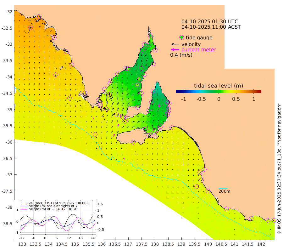 1cm/s -65T +10cm/s rms + 5cm/s 114T. SAM1DS 520m 4cm/s 45T +13cm/s rms + 5cm/s -36T. SAM2CP 100m 2cm/s -7T +21cm/s rms + 18cm/s 142T. SAM3MS 168m 7cm/s -51T +22cm/s rms + 0cm/s -30T. SAM4CY 117m 4cm/s -13T +23cm/s rms + 2cm/s 99T. SAM5CB 94m 8cm/s 39T +8cm/s rms + 3cm/s -172T. SAM6IS 83m 1cm/s -48T +11cm/s rms + 7cm/s 150T. SAM7DS 519m 17cm/s 15T +10cm/s rms + 2cm/s 87T. SAM8SG 47m 13cm/s 12T +20cm/s rms + 12cm/s -168T. NRSKAI 101m 26cm Warrnambool 28cm Port Fairy 30cm Portland 31cm Port Macdonnell 32cm Beachport 35cm Cape Rabelais (off) 33cm Robe 37cm Cape Jaffa 36cm Kingston 36cm Victor Harbor 34cm Vivonne Bay 3cm Kingscote 7cm American River 15cm Penneshaw 6cm Cape Jervis -6cm Second Valley -17cm Port Noarlunga -18cm Port Stanvac -18cm Brighton -18cm Glenelg -27cm Port Adelaide (Outer Harbor) -36cm Angus Inlet (Garden Island) -37cm Ardrossan -11cm Port Vincent -13cm Port Giles 26cm Stenhouse Bay 30cm Althorpe Island 27cm Pondalowie Bay 16cm Point Turton 20cm Port Victoria 17cm Cape Elizabeth 13cm Tiparra Reef Light 6cm Wallaroo 3cm Middle Bank 15cm Port Broughton -3cm Port Pirie -8cm Red Cliff Point (Beacon 5) -9cm Port Bonython -10cm Whyalla -6cm Western Shoal Beacon -3cm Franklin Harbor 12cm Franklin Harbor Entrance Beacon 21cm Arno Bay 27cm Port Neill 30cm Cape Hardy 35cm Tumby Bay 31cm Reevesby Island 36cm Port Lincoln 38cm Taylors Landing 26cm Whalers Bay 34cm Wedge Island Mooring 36cm Shelf Edge Mooring 46cm Coffin Bay Entrance Beacon 41cm Greenly Island 50cm Elliston 51cm Pearson Island 37cm Venus Bay 66cm Blanche Port (Streaky Bay) 65cm Thevenard 62cm St Francis Island