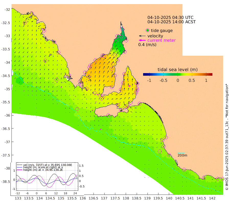 1cm/s -66T +10cm/s rms + 5cm/s 114T. SAM1DS 520m 3cm/s -129T +13cm/s rms + 5cm/s -36T. SAM2CP 100m 2cm/s -70T +21cm/s rms + 18cm/s 142T. SAM3MS 168m 7cm/s -92T +22cm/s rms + 0cm/s -30T. SAM4CY 117m 4cm/s -151T +23cm/s rms + 2cm/s 99T. SAM5CB 94m 3cm/s 66T +8cm/s rms + 3cm/s -172T. SAM6IS 83m 0cm/s -141T +11cm/s rms + 7cm/s 150T. SAM7DS 519m 9cm/s -8T +10cm/s rms + 2cm/s 87T. SAM8SG 47m 6cm/s 11T +20cm/s rms + 12cm/s -168T. NRSKAI 101m 16cm Warrnambool 16cm Port Fairy 16cm Portland 20cm Port Macdonnell 15cm Beachport 18cm Cape Rabelais (off) 19cm Robe 22cm Cape Jaffa 20cm Kingston 21cm Victor Harbor 12cm Vivonne Bay 38cm Kingscote 35cm American River 37cm Penneshaw 33cm Cape Jervis 32cm Second Valley 44cm Port Noarlunga 46cm Port Stanvac 44cm Brighton 47cm Glenelg 48cm Port Adelaide (Outer Harbor) 29cm Angus Inlet (Garden Island) 58cm Ardrossan 64cm Port Vincent 53cm Port Giles 33cm Stenhouse Bay 32cm Althorpe Island 30cm Pondalowie Bay 47cm Point Turton 51cm Port Victoria 49cm Cape Elizabeth 43cm Tiparra Reef Light 33cm Wallaroo 33cm Middle Bank 9cm Port Broughton -22cm Port Pirie -32cm Red Cliff Point (Beacon 5) -11cm Port Bonython -6cm Whyalla 0cm Western Shoal Beacon 37cm Franklin Harbor 52cm Franklin Harbor Entrance Beacon 55cm Arno Bay 60cm Port Neill 56cm Cape Hardy 53cm Tumby Bay 48cm Reevesby Island 46cm Port Lincoln 34cm Taylors Landing 43cm Whalers Bay 33cm Wedge Island Mooring 17cm Shelf Edge Mooring 27cm Coffin Bay Entrance Beacon 19cm Greenly Island 25cm Elliston 24cm Pearson Island 27cm Venus Bay 41cm Blanche Port (Streaky Bay) 37cm Thevenard 32cm St Francis Island