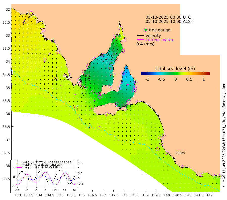 1cm/s -66T +10cm/s rms + 5cm/s 114T. SAM1DS 520m 5cm/s 53T +13cm/s rms + 5cm/s -36T. SAM2CP 100m 0cm/s 22T +21cm/s rms + 18cm/s 142T. SAM3MS 168m 6cm/s -21T +22cm/s rms + 0cm/s -30T. SAM4CY 117m 6cm/s 8T +23cm/s rms + 2cm/s 99T. SAM5CB 94m 5cm/s 34T +8cm/s rms + 3cm/s -172T. SAM6IS 83m 1cm/s -80T +11cm/s rms + 7cm/s 150T. SAM7DS 519m 9cm/s 30T +10cm/s rms + 2cm/s 87T. SAM8SG 47m 8cm/s 12T +20cm/s rms + 12cm/s -168T. NRSKAI 101m 18cm Warrnambool 19cm Port Fairy 21cm Portland 19cm Port Macdonnell 22cm Beachport 23cm Cape Rabelais (off) 21cm Robe 24cm Cape Jaffa 23cm Kingston 21cm Victor Harbor 25cm Vivonne Bay -27cm Kingscote -19cm American River -13cm Penneshaw -19cm Cape Jervis -31cm Second Valley -52cm Port Noarlunga -55cm Port Stanvac -54cm Brighton -56cm Glenelg -66cm Port Adelaide (Outer Harbor) -61cm Angus Inlet (Garden Island) -84cm Ardrossan -65cm Port Vincent -54cm Port Giles 2cm Stenhouse Bay 7cm Althorpe Island 6cm Pondalowie Bay -16cm Point Turton -14cm Port Victoria -16cm Cape Elizabeth -17cm Tiparra Reef Light -14cm Wallaroo -16cm Middle Bank 16cm Port Broughton 20cm Port Pirie 23cm Red Cliff Point (Beacon 5) 3cm Port Bonython 0cm Whyalla -2cm Western Shoal Beacon -27cm Franklin Harbor -24cm Franklin Harbor Entrance Beacon -18cm Arno Bay -17cm Port Neill -9cm Cape Hardy -3cm Tumby Bay -6cm Reevesby Island 3cm Port Lincoln 13cm Taylors Landing -5cm Whalers Bay 10cm Wedge Island Mooring 24cm Shelf Edge Mooring 26cm Coffin Bay Entrance Beacon 27cm Greenly Island 32cm Elliston 32cm Pearson Island 17cm Venus Bay 35cm Blanche Port (Streaky Bay) 36cm Thevenard 36cm St Francis Island
