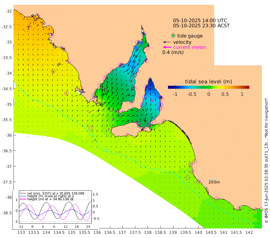 1cm/s 117T +10cm/s rms + 5cm/s 114T. SAM1DS 520m 9cm/s 54T +13cm/s rms + 5cm/s -36T. SAM2CP 100m 7cm/s 96T +21cm/s rms + 18cm/s 142T. SAM3MS 168m 4cm/s 126T +22cm/s rms + 0cm/s -30T. SAM4CY 117m 5cm/s -7T +23cm/s rms + 2cm/s 99T. SAM5CB 94m 11cm/s 56T +8cm/s rms + 3cm/s -172T. SAM6IS 83m 3cm/s 98T +11cm/s rms + 7cm/s 150T. SAM7DS 519m 14cm/s 65T +10cm/s rms + 2cm/s 87T. SAM8SG 47m 9cm/s 24T +20cm/s rms + 12cm/s -168T. NRSKAI 101m 13cm Warrnambool 14cm Port Fairy 15cm Portland 16cm Port Macdonnell 17cm Beachport 19cm Cape Rabelais (off) 18cm Robe 18cm Cape Jaffa 20cm Kingston 17cm Victor Harbor 24cm Vivonne Bay -35cm Kingscote -30cm American River -20cm Penneshaw -31cm Cape Jervis -50cm Second Valley -63cm Port Noarlunga -67cm Port Stanvac -69cm Brighton -71cm Glenelg -81cm Port Adelaide (Outer Harbor) -92cm Angus Inlet (Garden Island) -97cm Ardrossan -59cm Port Vincent -58cm Port Giles 8cm Stenhouse Bay 6cm Althorpe Island 10cm Pondalowie Bay -10cm Point Turton -14cm Port Victoria -22cm Cape Elizabeth -25cm Tiparra Reef Light -42cm Wallaroo -52cm Middle Bank -18cm Port Broughton -72cm Port Pirie -90cm Red Cliff Point (Beacon 5) -72cm Port Bonython -81cm Whyalla -73cm Western Shoal Beacon -47cm Franklin Harbor -32cm Franklin Harbor Entrance Beacon -16cm Arno Bay -8cm Port Neill -5cm Cape Hardy 2cm Tumby Bay 8cm Reevesby Island 15cm Port Lincoln 22cm Taylors Landing -2cm Whalers Bay 13cm Wedge Island Mooring 22cm Shelf Edge Mooring 33cm Coffin Bay Entrance Beacon 28cm Greenly Island 35cm Elliston 40cm Pearson Island 27cm Venus Bay 57cm Blanche Port (Streaky Bay) 58cm Thevenard 51cm St Francis Island