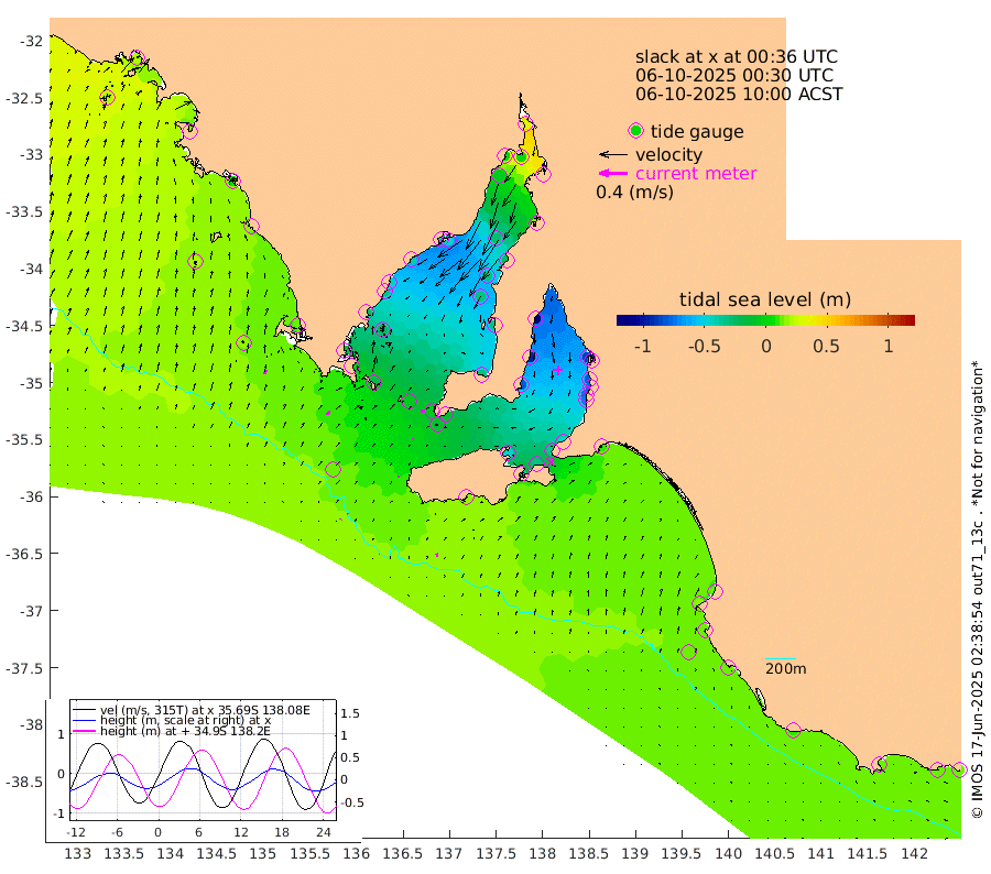 1cm/s -73T +10cm/s rms + 5cm/s 114T. SAM1DS 520m 6cm/s 61T +13cm/s rms + 5cm/s -36T. SAM2CP 100m 2cm/s 158T +21cm/s rms + 18cm/s 142T. SAM3MS 168m 4cm/s -5T +22cm/s rms + 0cm/s -30T. SAM4CY 117m 6cm/s 17T +23cm/s rms + 2cm/s 99T. SAM5CB 94m 2cm/s 25T +8cm/s rms + 3cm/s -172T. SAM6IS 83m 1cm/s -144T +11cm/s rms + 7cm/s 150T. SAM7DS 519m 4cm/s 89T +10cm/s rms + 2cm/s 87T. SAM8SG 47m 2cm/s 16T +20cm/s rms + 12cm/s -168T. NRSKAI 101m 12cm Warrnambool 12cm Port Fairy 13cm Portland 10cm Port Macdonnell 14cm Beachport 14cm Cape Rabelais (off) 13cm Robe 15cm Cape Jaffa 15cm Kingston 10cm Victor Harbor 16cm Vivonne Bay -46cm Kingscote -36cm American River -31cm Penneshaw -35cm Cape Jervis -48cm Second Valley -73cm Port Noarlunga -77cm Port Stanvac -76cm Brighton -80cm Glenelg -89cm Port Adelaide (Outer Harbor) -79cm Angus Inlet (Garden Island) -113cm Ardrossan -94cm Port Vincent -79cm Port Giles -13cm Stenhouse Bay -8cm Althorpe Island -7cm Pondalowie Bay -33cm Point Turton -32cm Port Victoria -33cm Cape Elizabeth -33cm Tiparra Reef Light -26cm Wallaroo -30cm Middle Bank 19cm Port Broughton 26cm Port Pirie 32cm Red Cliff Point (Beacon 5) 3cm Port Bonython 0cm Whyalla -5cm Western Shoal Beacon -40cm Franklin Harbor -46cm Franklin Harbor Entrance Beacon -41cm Arno Bay -43cm Port Neill -33cm Cape Hardy -26cm Tumby Bay -26cm Reevesby Island -17cm Port Lincoln -3cm Taylors Landing -22cm Whalers Bay -5cm Wedge Island Mooring 14cm Shelf Edge Mooring 13cm Coffin Bay Entrance Beacon 16cm Greenly Island 18cm Elliston 19cm Pearson Island 6cm Venus Bay 17cm Blanche Port (Streaky Bay) 19cm Thevenard 21cm St Francis Island