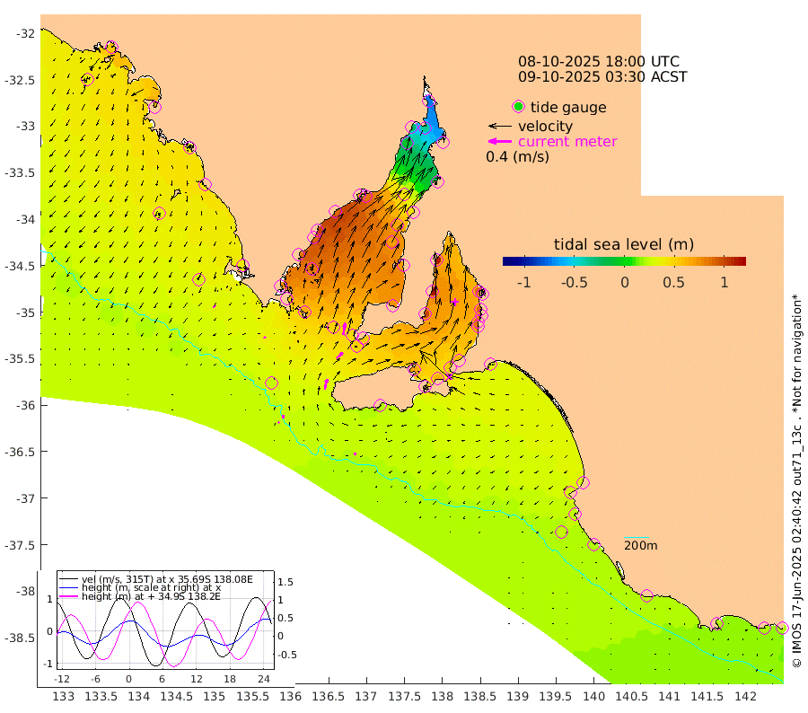 0cm/s -139T +10cm/s rms + 5cm/s 114T. SAM1DS 520m 4cm/s -71T +13cm/s rms + 5cm/s -36T. SAM2CP 100m 6cm/s 3T +21cm/s rms + 18cm/s 142T. SAM3MS 168m 4cm/s -86T +22cm/s rms + 0cm/s -30T. SAM4CY 117m 5cm/s -131T +23cm/s rms + 2cm/s 99T. SAM5CB 94m 15cm/s 48T +8cm/s rms + 3cm/s -172T. SAM6IS 83m 3cm/s 35T +11cm/s rms + 7cm/s 150T. SAM7DS 519m 21cm/s 10T +10cm/s rms + 2cm/s 87T. SAM8SG 47m 18cm/s 12T +20cm/s rms + 12cm/s -168T. NRSKAI 101m 20cm Warrnambool 19cm Port Fairy 21cm Portland 26cm Port Macdonnell 21cm Beachport 23cm Cape Rabelais (off) 25cm Robe 28cm Cape Jaffa 27cm Kingston 32cm Victor Harbor 21cm Vivonne Bay 67cm Kingscote 56cm American River 63cm Penneshaw 54cm Cape Jervis 61cm Second Valley 80cm Port Noarlunga 83cm Port Stanvac 81cm Brighton 87cm Glenelg 89cm Port Adelaide (Outer Harbor) 56cm Angus Inlet (Garden Island) 109cm Ardrossan 113cm Port Vincent 98cm Port Giles 54cm Stenhouse Bay 52cm Althorpe Island 45cm Pondalowie Bay 73cm Point Turton 70cm Port Victoria 68cm Cape Elizabeth 66cm Tiparra Reef Light 42cm Wallaroo 42cm Middle Bank -18cm Port Broughton -57cm Port Pirie -73cm Red Cliff Point (Beacon 5) -35cm Port Bonython -25cm Whyalla -9cm Western Shoal Beacon 56cm Franklin Harbor 86cm Franklin Harbor Entrance Beacon 89cm Arno Bay 100cm Port Neill 87cm Cape Hardy 84cm Tumby Bay 79cm Reevesby Island 75cm Port Lincoln 55cm Taylors Landing 66cm Whalers Bay 51cm Wedge Island Mooring 26cm Shelf Edge Mooring 40cm Coffin Bay Entrance Beacon 27cm Greenly Island 38cm Elliston 30cm Pearson Island 40cm Venus Bay 58cm Blanche Port (Streaky Bay) 54cm Thevenard 36cm St Francis Island