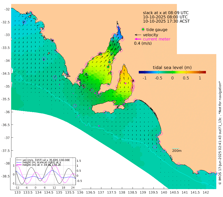 1cm/s 81T +10cm/s rms + 5cm/s 114T. SAM1DS 520m 2cm/s -138T +13cm/s rms + 5cm/s -36T. SAM2CP 100m 4cm/s 53T +21cm/s rms + 18cm/s 142T. SAM3MS 168m 8cm/s 126T +22cm/s rms + 0cm/s -30T. SAM4CY 117m 5cm/s -180T +23cm/s rms + 2cm/s 99T. SAM5CB 94m 2cm/s 150T +8cm/s rms + 3cm/s -172T. SAM6IS 83m 2cm/s 59T +11cm/s rms + 7cm/s 150T. SAM7DS 519m 8cm/s 164T +10cm/s rms + 2cm/s 87T. SAM8SG 47m 4cm/s -173T +20cm/s rms + 12cm/s -168T. NRSKAI 101m -50cm Warrnambool -47cm Port Fairy -47cm Portland -42cm Port Macdonnell -42cm Beachport -44cm Cape Rabelais (off) -43cm Robe -44cm Cape Jaffa -44cm Kingston -39cm Victor Harbor -40cm Vivonne Bay 20cm Kingscote 11cm American River 5cm Penneshaw 11cm Cape Jervis 27cm Second Valley 49cm Port Noarlunga 53cm Port Stanvac 56cm Brighton 60cm Glenelg 67cm Port Adelaide (Outer Harbor) 55cm Angus Inlet (Garden Island) 91cm Ardrossan 74cm Port Vincent 56cm Port Giles -13cm Stenhouse Bay -21cm Althorpe Island -20cm Pondalowie Bay -8cm Point Turton -3cm Port Victoria -2cm Cape Elizabeth -14cm Tiparra Reef Light -23cm Wallaroo -19cm Middle Bank -45cm Port Broughton -80cm Port Pirie -76cm Red Cliff Point (Beacon 5) -59cm Port Bonython -54cm Whyalla -49cm Western Shoal Beacon 0cm Franklin Harbor 4cm Franklin Harbor Entrance Beacon 2cm Arno Bay 1cm Port Neill -5cm Cape Hardy -9cm Tumby Bay -15cm Reevesby Island -17cm Port Lincoln -25cm Taylors Landing -10cm Whalers Bay -24cm Wedge Island Mooring -39cm Shelf Edge Mooring -41cm Coffin Bay Entrance Beacon -40cm Greenly Island -41cm Elliston -42cm Pearson Island -31cm Venus Bay -48cm Blanche Port (Streaky Bay) -48cm Thevenard -58cm St Francis Island