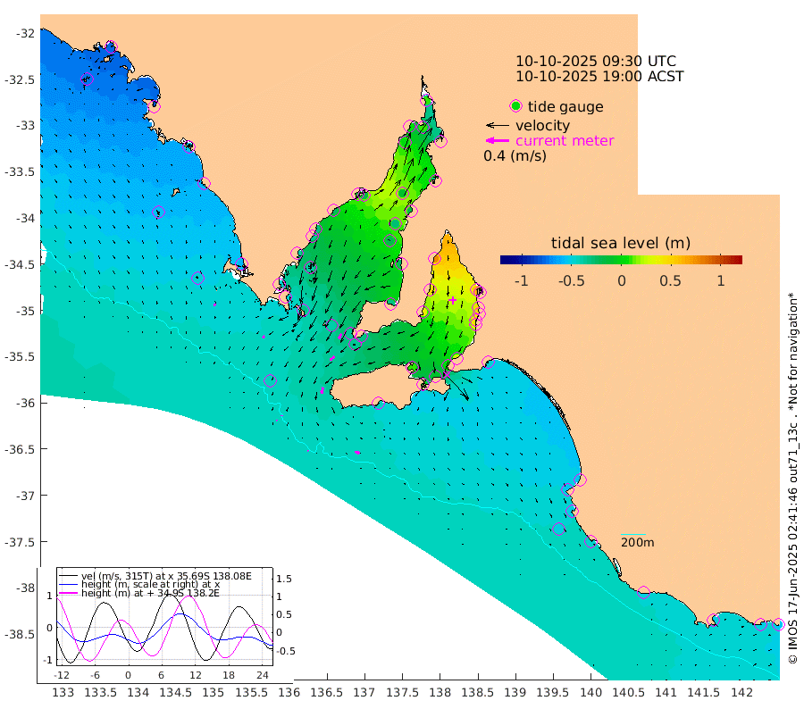 1cm/s 111T +10cm/s rms + 5cm/s 114T. SAM1DS 520m 4cm/s -131T +13cm/s rms + 5cm/s -36T. SAM2CP 100m 2cm/s -8T +21cm/s rms + 18cm/s 142T. SAM3MS 168m 8cm/s 106T +22cm/s rms + 0cm/s -30T. SAM4CY 117m 4cm/s 163T +23cm/s rms + 2cm/s 99T. SAM5CB 94m 10cm/s -126T +8cm/s rms + 3cm/s -172T. SAM6IS 83m 1cm/s -16T +11cm/s rms + 7cm/s 150T. SAM7DS 519m 10cm/s -155T +10cm/s rms + 2cm/s 87T. SAM8SG 47m 11cm/s -165T +20cm/s rms + 12cm/s -168T. NRSKAI 101m -53cm Warrnambool -49cm Port Fairy -50cm Portland -49cm Port Macdonnell -46cm Beachport -49cm Cape Rabelais (off) -50cm Robe -54cm Cape Jaffa -53cm Kingston -47cm Victor Harbor -44cm Vivonne Bay 8cm Kingscote 3cm American River -9cm Penneshaw 4cm Cape Jervis 23cm Second Valley 40cm Port Noarlunga 43cm Port Stanvac 47cm Brighton 48cm Glenelg 59cm Port Adelaide (Outer Harbor) 70cm Angus Inlet (Garden Island) 77cm Ardrossan 47cm Port Vincent 34cm Port Giles -32cm Stenhouse Bay -37cm Althorpe Island -36cm Pondalowie Bay -31cm Point Turton -26cm Port Victoria -22cm Cape Elizabeth -26cm Tiparra Reef Light -16cm Wallaroo -8cm Middle Bank -32cm Port Broughton -6cm Port Pirie 10cm Red Cliff Point (Beacon 5) 8cm Port Bonython 7cm Whyalla 1cm Western Shoal Beacon -5cm Franklin Harbor -16cm Franklin Harbor Entrance Beacon -24cm Arno Bay -33cm Port Neill -35cm Cape Hardy -39cm Tumby Bay -40cm Reevesby Island -45cm Port Lincoln -46cm Taylors Landing -32cm Whalers Bay -41cm Wedge Island Mooring -44cm Shelf Edge Mooring -57cm Coffin Bay Entrance Beacon -48cm Greenly Island -58cm Elliston -53cm Pearson Island -49cm Venus Bay -79cm Blanche Port (Streaky Bay) -76cm Thevenard -71cm St Francis Island