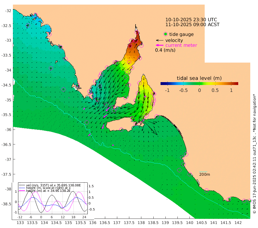 1cm/s -134T +10cm/s rms + 5cm/s 114T. SAM1DS 520m 11cm/s -131T +13cm/s rms + 5cm/s -36T. SAM2CP 100m 11cm/s -131T +21cm/s rms + 18cm/s 142T. SAM3MS 168m 8cm/s -84T +22cm/s rms + 0cm/s -30T. SAM4CY 117m 2cm/s 150T +23cm/s rms + 2cm/s 99T. SAM5CB 94m 25cm/s -125T +8cm/s rms + 3cm/s -172T. SAM6IS 83m 5cm/s -131T +11cm/s rms + 7cm/s 150T. SAM7DS 519m 28cm/s -136T +10cm/s rms + 2cm/s 87T. SAM8SG 47m 22cm/s -164T +20cm/s rms + 12cm/s -168T. NRSKAI 101m -4cm Warrnambool -5cm Port Fairy -6cm Portland -8cm Port Macdonnell -9cm Beachport -9cm Cape Rabelais (off) -10cm Robe -10cm Cape Jaffa -10cm Kingston -12cm Victor Harbor -16cm Vivonne Bay 9cm Kingscote 17cm American River -2cm Penneshaw 13cm Cape Jervis 26cm Second Valley 25cm Port Noarlunga 26cm Port Stanvac 29cm Brighton 27cm Glenelg 34cm Port Adelaide (Outer Harbor) 70cm Angus Inlet (Garden Island) 34cm Ardrossan 10cm Port Vincent 7cm Port Giles -19cm Stenhouse Bay -9cm Althorpe Island -12cm Pondalowie Bay -7cm Point Turton -5cm Port Victoria 3cm Cape Elizabeth 21cm Tiparra Reef Light 54cm Wallaroo 59cm Middle Bank 78cm Port Broughton 166cm Port Pirie 187cm Red Cliff Point (Beacon 5) 149cm Port Bonython 145cm Whyalla 130cm Western Shoal Beacon 39cm Franklin Harbor 1cm Franklin Harbor Entrance Beacon -16cm Arno Bay -26cm Port Neill -25cm Cape Hardy -30cm Tumby Bay -24cm Reevesby Island -35cm Port Lincoln -32cm Taylors Landing -12cm Whalers Bay -19cm Wedge Island Mooring -13cm Shelf Edge Mooring -24cm Coffin Bay Entrance Beacon -20cm Greenly Island -27cm Elliston -26cm Pearson Island -18cm Venus Bay -45cm Blanche Port (Streaky Bay) -46cm Thevenard -27cm St Francis Island