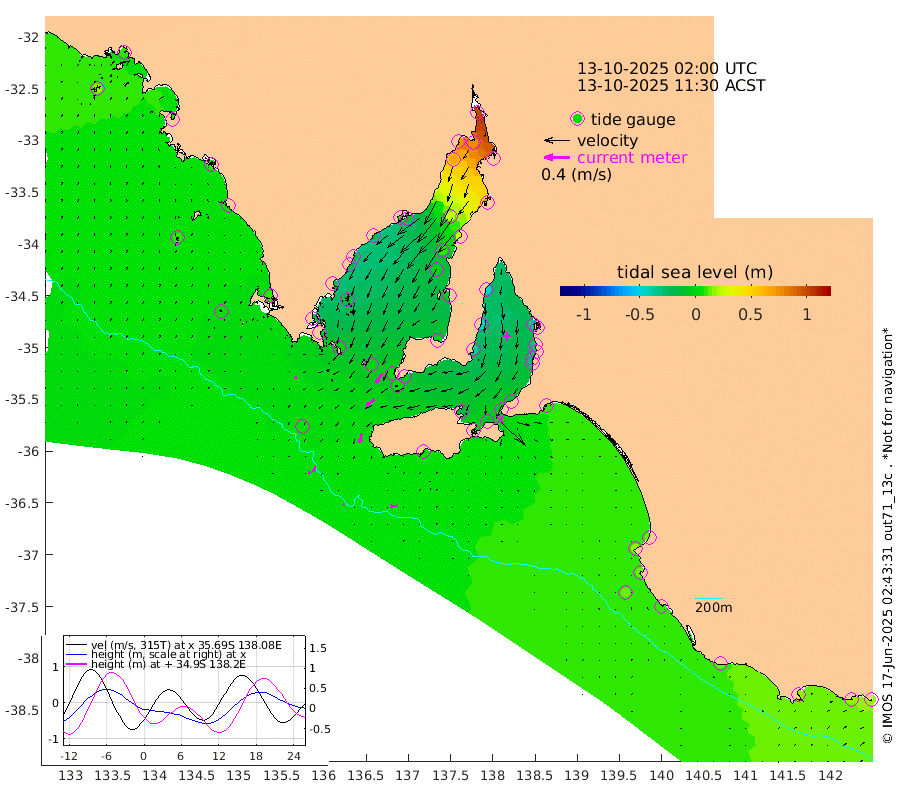 1cm/s -103T +10cm/s rms + 5cm/s 114T. SAM1DS 520m 4cm/s -155T +13cm/s rms + 5cm/s -36T. SAM2CP 100m 9cm/s -157T +21cm/s rms + 18cm/s 142T. SAM3MS 168m 10cm/s -94T +22cm/s rms + 0cm/s -30T. SAM4CY 117m 1cm/s 56T +23cm/s rms + 2cm/s 99T. SAM5CB 94m 16cm/s -129T +8cm/s rms + 3cm/s -172T. SAM6IS 83m 5cm/s -157T +11cm/s rms + 7cm/s 150T. SAM7DS 519m 17cm/s -148T +10cm/s rms + 2cm/s 87T. SAM8SG 47m 14cm/s -168T +20cm/s rms + 12cm/s -168T. NRSKAI 101m 18cm Warrnambool 17cm Port Fairy 16cm Portland 14cm Port Macdonnell 11cm Beachport 13cm Cape Rabelais (off) 13cm Robe 15cm Cape Jaffa 14cm Kingston 8cm Victor Harbor 5cm Vivonne Bay -18cm Kingscote -7cm American River -14cm Penneshaw -9cm Cape Jervis -16cm Second Valley -29cm Port Noarlunga -30cm Port Stanvac -31cm Brighton -33cm Glenelg -36cm Port Adelaide (Outer Harbor) -16cm Angus Inlet (Garden Island) -51cm Ardrossan -47cm Port Vincent -39cm Port Giles -6cm Stenhouse Bay 2cm Althorpe Island 2cm Pondalowie Bay -2cm Point Turton 0cm Port Victoria -1cm Cape Elizabeth 10cm Tiparra Reef Light 28cm Wallaroo 25cm Middle Bank 69cm Port Broughton 98cm Port Pirie 101cm Red Cliff Point (Beacon 5) 76cm Port Bonython 72cm Whyalla 65cm Western Shoal Beacon 10cm Franklin Harbor -12cm Franklin Harbor Entrance Beacon -15cm Arno Bay -20cm Port Neill -16cm Cape Hardy -15cm Tumby Bay -9cm Reevesby Island -12cm Port Lincoln -7cm Taylors Landing -2cm Whalers Bay -1cm Wedge Island Mooring 7cm Shelf Edge Mooring 8cm Coffin Bay Entrance Beacon 7cm Greenly Island 7cm Elliston 8cm Pearson Island 9cm Venus Bay 9cm Blanche Port (Streaky Bay) 8cm Thevenard 18cm St Francis Island