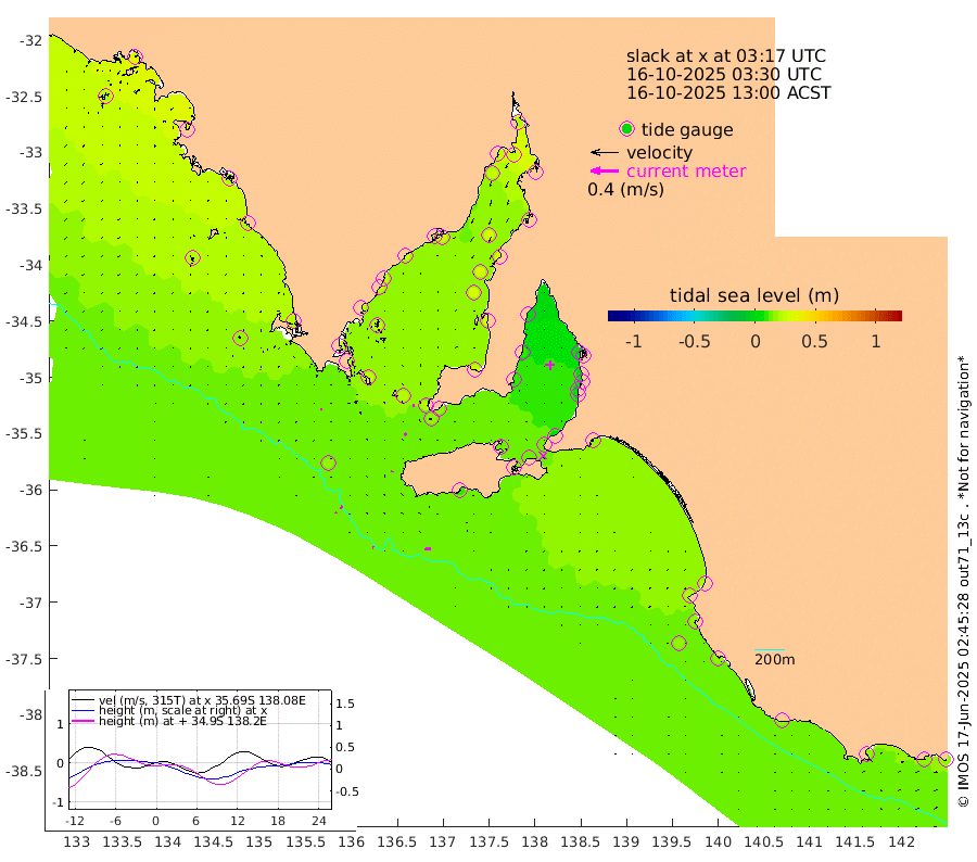1cm/s -82T +10cm/s rms + 5cm/s 114T. SAM1DS 520m 2cm/s -146T +13cm/s rms + 5cm/s -36T. SAM2CP 100m 4cm/s -142T +21cm/s rms + 18cm/s 142T. SAM3MS 168m 8cm/s -91T +22cm/s rms + 0cm/s -30T. SAM4CY 117m 1cm/s -154T +23cm/s rms + 2cm/s 99T. SAM5CB 94m 4cm/s -124T +8cm/s rms + 3cm/s -172T. SAM6IS 83m 2cm/s -163T +11cm/s rms + 7cm/s 150T. SAM7DS 519m 3cm/s -85T +10cm/s rms + 2cm/s 87T. SAM8SG 47m 1cm/s -170T +20cm/s rms + 12cm/s -168T. NRSKAI 101m 17cm Warrnambool 17cm Port Fairy 17cm Portland 18cm Port Macdonnell 15cm Beachport 16cm Cape Rabelais (off) 18cm Robe 21cm Cape Jaffa 19cm Kingston 17cm Victor Harbor 11cm Vivonne Bay 11cm Kingscote 13cm American River 13cm Penneshaw 12cm Cape Jervis 7cm Second Valley 6cm Port Noarlunga 7cm Port Stanvac 6cm Brighton 7cm Glenelg 5cm Port Adelaide (Outer Harbor) 3cm Angus Inlet (Garden Island) 1cm Ardrossan 9cm Port Vincent 8cm Port Giles 16cm Stenhouse Bay 18cm Althorpe Island 19cm Pondalowie Bay 26cm Point Turton 30cm Port Victoria 28cm Cape Elizabeth 26cm Tiparra Reef Light 28cm Wallaroo 28cm Middle Bank 32cm Port Broughton 27cm Port Pirie 21cm Red Cliff Point (Beacon 5) 23cm Port Bonython 24cm Whyalla 24cm Western Shoal Beacon 26cm Franklin Harbor 26cm Franklin Harbor Entrance Beacon 25cm Arno Bay 24cm Port Neill 23cm Cape Hardy 23cm Tumby Bay 24cm Reevesby Island 23cm Port Lincoln 19cm Taylors Landing 24cm Whalers Bay 21cm Wedge Island Mooring 15cm Shelf Edge Mooring 22cm Coffin Bay Entrance Beacon 17cm Greenly Island 22cm Elliston 19cm Pearson Island 21cm Venus Bay 32cm Blanche Port (Streaky Bay) 31cm Thevenard 21cm St Francis Island