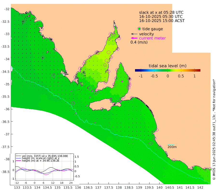 1cm/s -72T +10cm/s rms + 5cm/s 114T. SAM1DS 520m 4cm/s -151T +13cm/s rms + 5cm/s -36T. SAM2CP 100m 4cm/s -166T +21cm/s rms + 18cm/s 142T. SAM3MS 168m 7cm/s -113T +22cm/s rms + 0cm/s -30T. SAM4CY 117m 3cm/s 180T +23cm/s rms + 2cm/s 99T. SAM5CB 94m 5cm/s -149T +8cm/s rms + 3cm/s -172T. SAM6IS 83m 2cm/s 178T +11cm/s rms + 7cm/s 150T. SAM7DS 519m 11cm/s -158T +10cm/s rms + 2cm/s 87T. SAM8SG 47m 7cm/s -171T +20cm/s rms + 12cm/s -168T. NRSKAI 101m 9cm Warrnambool 7cm Port Fairy 6cm Portland 6cm Port Macdonnell 2cm Beachport 2cm Cape Rabelais (off) 5cm Robe 5cm Cape Jaffa 4cm Kingston 1cm Victor Harbor -5cm Vivonne Bay 7cm Kingscote 6cm American River 5cm Penneshaw 6cm Cape Jervis 4cm Second Valley 8cm Port Noarlunga 10cm Port Stanvac 9cm Brighton 10cm Glenelg 10cm Port Adelaide (Outer Harbor) 10cm Angus Inlet (Garden Island) 10cm Ardrossan 4cm Port Vincent 11cm Port Giles 6cm Stenhouse Bay 6cm Althorpe Island 7cm Pondalowie Bay 18cm Point Turton 21cm Port Victoria 17cm Cape Elizabeth 19cm Tiparra Reef Light 21cm Wallaroo 20cm Middle Bank 25cm Port Broughton 15cm Port Pirie 7cm Red Cliff Point (Beacon 5) 12cm Port Bonython 15cm Whyalla 14cm Western Shoal Beacon 23cm Franklin Harbor 17cm Franklin Harbor Entrance Beacon 14cm Arno Bay 12cm Port Neill 8cm Cape Hardy 6cm Tumby Bay 7cm Reevesby Island 6cm Port Lincoln 1cm Taylors Landing 12cm Whalers Bay 5cm Wedge Island Mooring -3cm Shelf Edge Mooring -1cm Coffin Bay Entrance Beacon -3cm Greenly Island -2cm Elliston -6cm Pearson Island 3cm Venus Bay 0cm Blanche Port (Streaky Bay) -1cm Thevenard -4cm St Francis Island