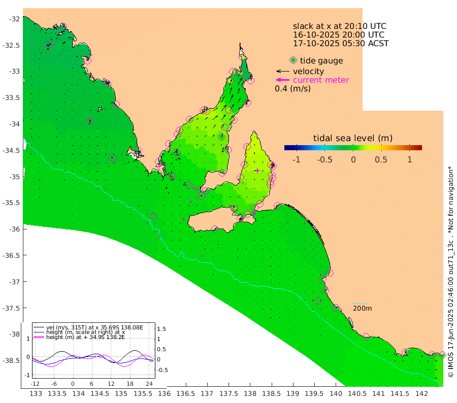 0cm/s 79T +10cm/s rms + 5cm/s 114T. SAM1DS 520m 2cm/s -85T +13cm/s rms + 5cm/s -36T. SAM2CP 100m 5cm/s -24T +21cm/s rms + 18cm/s 142T. SAM3MS 168m 5cm/s 19T +22cm/s rms + 0cm/s -30T. SAM4CY 117m 1cm/s -177T +23cm/s rms + 2cm/s 99T. SAM5CB 94m 6cm/s 37T +8cm/s rms + 3cm/s -172T. SAM6IS 83m 2cm/s -13T +11cm/s rms + 7cm/s 150T. SAM7DS 519m 7cm/s -10T +10cm/s rms + 2cm/s 87T. SAM8SG 47m 6cm/s 2T +20cm/s rms + 12cm/s -168T. NRSKAI 101m 7cm Warrnambool 4cm Port Fairy 4cm Portland 0cm Port Macdonnell 2cm Beachport 1cm Cape Rabelais (off) 0cm Robe -1cm Cape Jaffa 1cm Kingston 2cm Victor Harbor 0cm Vivonne Bay 13cm Kingscote 10cm American River 12cm Penneshaw 11cm Cape Jervis 19cm Second Valley 20cm Port Noarlunga 21cm Port Stanvac 22cm Brighton 23cm Glenelg 25cm Port Adelaide (Outer Harbor) 26cm Angus Inlet (Garden Island) 30cm Ardrossan 15cm Port Vincent 21cm Port Giles 2cm Stenhouse Bay 4cm Althorpe Island -2cm Pondalowie Bay 5cm Point Turton 2cm Port Victoria 7cm Cape Elizabeth 11cm Tiparra Reef Light 13cm Wallaroo 17cm Middle Bank -11cm Port Broughton 18cm Port Pirie 31cm Red Cliff Point (Beacon 5) 22cm Port Bonython 24cm Whyalla 22cm Western Shoal Beacon 16cm Franklin Harbor 18cm Franklin Harbor Entrance Beacon 11cm Arno Bay 15cm Port Neill 9cm Cape Hardy 7cm Tumby Bay 1cm Reevesby Island 1cm Port Lincoln -1cm Taylors Landing 2cm Whalers Bay 0cm Wedge Island Mooring -1cm Shelf Edge Mooring -7cm Coffin Bay Entrance Beacon -6cm Greenly Island -9cm Elliston -13cm Pearson Island -9cm Venus Bay -20cm Blanche Port (Streaky Bay) -20cm Thevenard -15cm St Francis Island