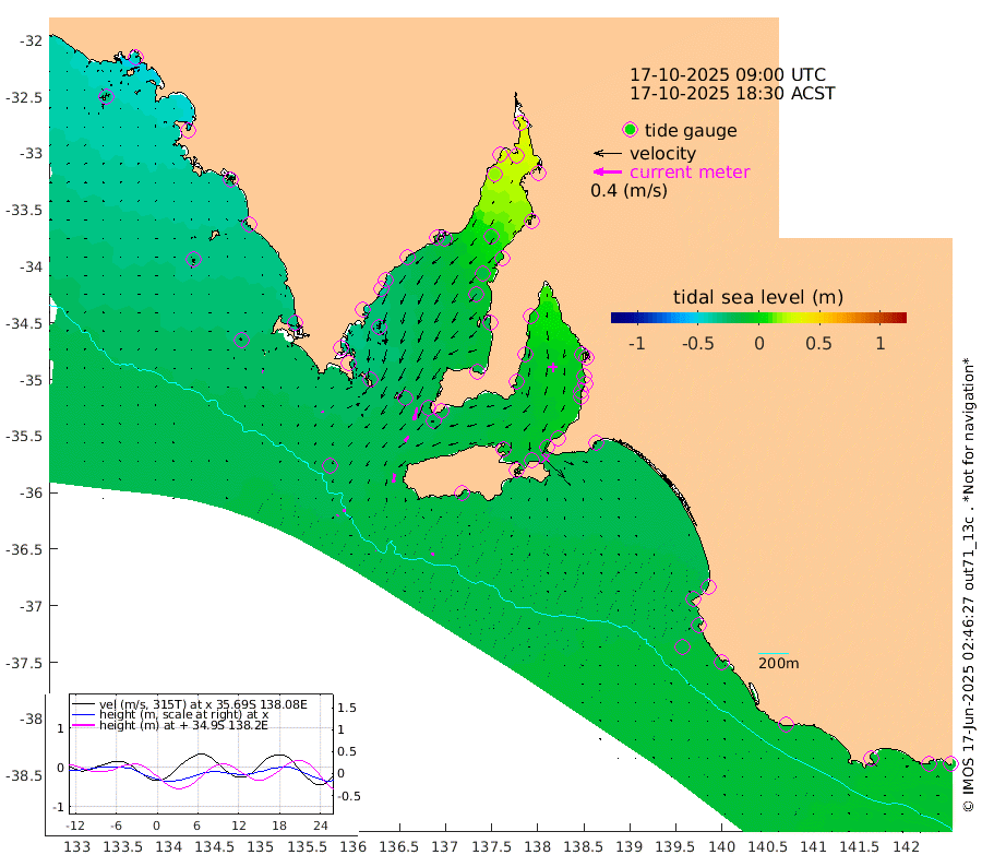 0cm/s 91T +10cm/s rms + 5cm/s 114T. SAM1DS 520m 2cm/s -162T +13cm/s rms + 5cm/s -36T. SAM2CP 100m 4cm/s -176T +21cm/s rms + 18cm/s 142T. SAM3MS 168m 4cm/s -163T +22cm/s rms + 0cm/s -30T. SAM4CY 117m 1cm/s 116T +23cm/s rms + 2cm/s 99T. SAM5CB 94m 10cm/s -143T +8cm/s rms + 3cm/s -172T. SAM6IS 83m 2cm/s -154T +11cm/s rms + 7cm/s 150T. SAM7DS 519m 18cm/s -166T +10cm/s rms + 2cm/s 87T. SAM8SG 47m 13cm/s -170T +20cm/s rms + 12cm/s -168T. NRSKAI 101m -11cm Warrnambool -12cm Port Fairy -13cm Portland -14cm Port Macdonnell -15cm Beachport -16cm Cape Rabelais (off) -16cm Robe -18cm Cape Jaffa -20cm Kingston -21cm Victor Harbor -18cm Vivonne Bay -11cm Kingscote -10cm American River -17cm Penneshaw -10cm Cape Jervis -5cm Second Valley -6cm Port Noarlunga -6cm Port Stanvac -3cm Brighton -5cm Glenelg -2cm Port Adelaide (Outer Harbor) 14cm Angus Inlet (Garden Island) -3cm Ardrossan -18cm Port Vincent -11cm Port Giles -19cm Stenhouse Bay -20cm Althorpe Island -18cm Pondalowie Bay -20cm Point Turton -20cm Port Victoria -21cm Cape Elizabeth -15cm Tiparra Reef Light -3cm Wallaroo -2cm Middle Bank 16cm Port Broughton 35cm Port Pirie 33cm Red Cliff Point (Beacon 5) 30cm Port Bonython 27cm Whyalla 18cm Western Shoal Beacon -4cm Franklin Harbor -24cm Franklin Harbor Entrance Beacon -30cm Arno Bay -36cm Port Neill -36cm Cape Hardy -38cm Tumby Bay -33cm Reevesby Island -33cm Port Lincoln -29cm Taylors Landing -22cm Whalers Bay -24cm Wedge Island Mooring -20cm Shelf Edge Mooring -30cm Coffin Bay Entrance Beacon -23cm Greenly Island -31cm Elliston -27cm Pearson Island -25cm Venus Bay -45cm Blanche Port (Streaky Bay) -44cm Thevenard -31cm St Francis Island