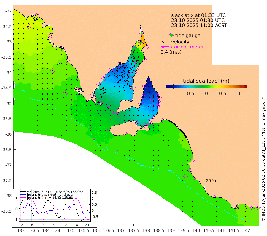 1cm/s -78T +10cm/s rms + 5cm/s 114T. SAM1DS 520m 6cm/s 86T +13cm/s rms + 5cm/s -36T. SAM2CP 100m 8cm/s 159T +21cm/s rms + 18cm/s 142T. SAM3MS 168m 3cm/s -111T +22cm/s rms + 0cm/s -30T. SAM4CY 117m 5cm/s 24T +23cm/s rms + 2cm/s 99T. SAM5CB 94m 5cm/s -161T +8cm/s rms + 3cm/s -172T. SAM6IS 83m 4cm/s 170T +11cm/s rms + 7cm/s 150T. SAM7DS 519m 16cm/s 169T +10cm/s rms + 2cm/s 87T. SAM8SG 47m 9cm/s -177T +20cm/s rms + 12cm/s -168T. NRSKAI 101m 12cm Warrnambool 11cm Port Fairy 11cm Portland 8cm Port Macdonnell 8cm Beachport 10cm Cape Rabelais (off) 10cm Robe 12cm Cape Jaffa 12cm Kingston 2cm Victor Harbor 8cm Vivonne Bay -64cm Kingscote -50cm American River -46cm Penneshaw -49cm Cape Jervis -69cm Second Valley -96cm Port Noarlunga -100cm Port Stanvac -100cm Brighton -104cm Glenelg -116cm Port Adelaide (Outer Harbor) -106cm Angus Inlet (Garden Island) -144cm Ardrossan -121cm Port Vincent -101cm Port Giles -19cm Stenhouse Bay -13cm Althorpe Island -10cm Pondalowie Bay -36cm Point Turton -35cm Port Victoria -41cm Cape Elizabeth -38cm Tiparra Reef Light -34cm Wallaroo -44cm Middle Bank 35cm Port Broughton 10cm Port Pirie 8cm Red Cliff Point (Beacon 5) -19cm Port Bonython -22cm Whyalla -23cm Western Shoal Beacon -50cm Franklin Harbor -61cm Franklin Harbor Entrance Beacon -54cm Arno Bay -53cm Port Neill -44cm Cape Hardy -36cm Tumby Bay -34cm Reevesby Island -25cm Port Lincoln -12cm Taylors Landing -26cm Whalers Bay -13cm Wedge Island Mooring 5cm Shelf Edge Mooring 8cm Coffin Bay Entrance Beacon 9cm Greenly Island 14cm Elliston 14cm Pearson Island 7cm Venus Bay 20cm Blanche Port (Streaky Bay) 21cm Thevenard 29cm St Francis Island