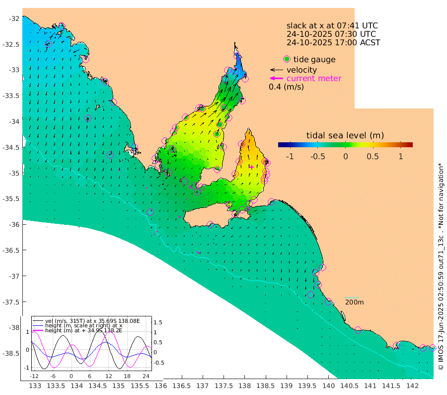1cm/s 68T +10cm/s rms + 5cm/s 114T. SAM1DS 520m 3cm/s -147T +13cm/s rms + 5cm/s -36T. SAM2CP 100m 4cm/s 62T +21cm/s rms + 18cm/s 142T. SAM3MS 168m 7cm/s 132T +22cm/s rms + 0cm/s -30T. SAM4CY 117m 5cm/s -179T +23cm/s rms + 2cm/s 99T. SAM5CB 94m 2cm/s 147T +8cm/s rms + 3cm/s -172T. SAM6IS 83m 2cm/s 55T +11cm/s rms + 7cm/s 150T. SAM7DS 519m 8cm/s 170T +10cm/s rms + 2cm/s 87T. SAM8SG 47m 5cm/s -173T +20cm/s rms + 12cm/s -168T. NRSKAI 101m -45cm Warrnambool -43cm Port Fairy -43cm Portland -39cm Port Macdonnell -40cm Beachport -41cm Cape Rabelais (off) -39cm Robe -42cm Cape Jaffa -43cm Kingston -37cm Victor Harbor -38cm Vivonne Bay 22cm Kingscote 13cm American River 8cm Penneshaw 13cm Cape Jervis 27cm Second Valley 51cm Port Noarlunga 54cm Port Stanvac 56cm Brighton 60cm Glenelg 68cm Port Adelaide (Outer Harbor) 54cm Angus Inlet (Garden Island) 94cm Ardrossan 73cm Port Vincent 57cm Port Giles -11cm Stenhouse Bay -19cm Althorpe Island -18cm Pondalowie Bay -6cm Point Turton -1cm Port Victoria -2cm Cape Elizabeth -10cm Tiparra Reef Light -19cm Wallaroo -16cm Middle Bank -40cm Port Broughton -77cm Port Pirie -78cm Red Cliff Point (Beacon 5) -58cm Port Bonython -52cm Whyalla -46cm Western Shoal Beacon -2cm Franklin Harbor 2cm Franklin Harbor Entrance Beacon 2cm Arno Bay 1cm Port Neill -1cm Cape Hardy -6cm Tumby Bay -12cm Reevesby Island -15cm Port Lincoln -25cm Taylors Landing -7cm Whalers Bay -23cm Wedge Island Mooring -38cm Shelf Edge Mooring -42cm Coffin Bay Entrance Beacon -38cm Greenly Island -41cm Elliston -39cm Pearson Island -30cm Venus Bay -48cm Blanche Port (Streaky Bay) -49cm Thevenard -46cm St Francis Island