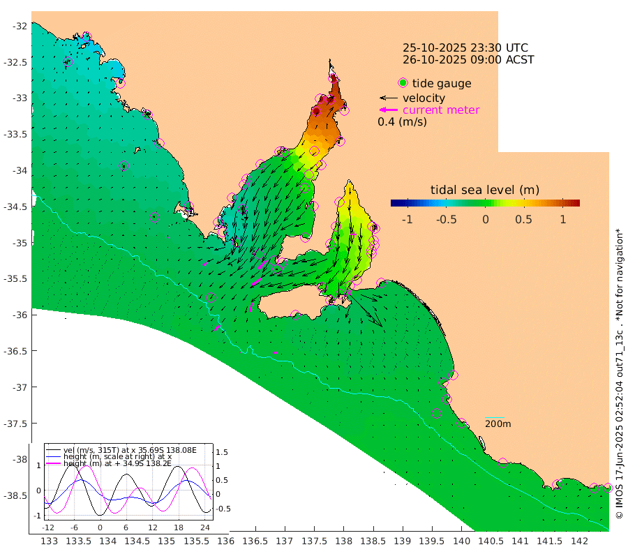 1cm/s -120T +10cm/s rms + 5cm/s 114T. SAM1DS 520m 9cm/s -130T +13cm/s rms + 5cm/s -36T. SAM2CP 100m 11cm/s -129T +21cm/s rms + 18cm/s 142T. SAM3MS 168m 9cm/s -85T +22cm/s rms + 0cm/s -30T. SAM4CY 117m 2cm/s 145T +23cm/s rms + 2cm/s 99T. SAM5CB 94m 25cm/s -124T +8cm/s rms + 3cm/s -172T. SAM6IS 83m 5cm/s -131T +11cm/s rms + 7cm/s 150T. SAM7DS 519m 26cm/s -136T +10cm/s rms + 2cm/s 87T. SAM8SG 47m 21cm/s -163T +20cm/s rms + 12cm/s -168T. NRSKAI 101m -4cm Warrnambool -3cm Port Fairy -5cm Portland -5cm Port Macdonnell -7cm Beachport -8cm Cape Rabelais (off) -9cm Robe -6cm Cape Jaffa -7cm Kingston -10cm Victor Harbor -15cm Vivonne Bay 9cm Kingscote 16cm American River -2cm Penneshaw 11cm Cape Jervis 25cm Second Valley 24cm Port Noarlunga 24cm Port Stanvac 25cm Brighton 24cm Glenelg 31cm Port Adelaide (Outer Harbor) 63cm Angus Inlet (Garden Island) 29cm Ardrossan 12cm Port Vincent 6cm Port Giles -18cm Stenhouse Bay -10cm Althorpe Island -10cm Pondalowie Bay -4cm Point Turton -2cm Port Victoria 8cm Cape Elizabeth 19cm Tiparra Reef Light 52cm Wallaroo 58cm Middle Bank 75cm Port Broughton 158cm Port Pirie 176cm Red Cliff Point (Beacon 5) 140cm Port Bonython 138cm Whyalla 122cm Western Shoal Beacon 43cm Franklin Harbor 5cm Franklin Harbor Entrance Beacon -13cm Arno Bay -26cm Port Neill -23cm Cape Hardy -28cm Tumby Bay -22cm Reevesby Island -32cm Port Lincoln -28cm Taylors Landing -11cm Whalers Bay -16cm Wedge Island Mooring -11cm Shelf Edge Mooring -21cm Coffin Bay Entrance Beacon -17cm Greenly Island -24cm Elliston -24cm Pearson Island -16cm Venus Bay -40cm Blanche Port (Streaky Bay) -42cm Thevenard -35cm St Francis Island