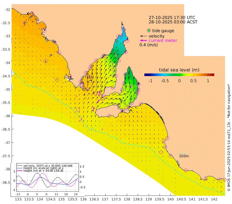 1cm/s 9T +10cm/s rms + 5cm/s 114T. SAM1DS 520m 6cm/s 21T +13cm/s rms + 5cm/s -36T. SAM2CP 100m 9cm/s 8T +21cm/s rms + 18cm/s 142T. SAM3MS 168m 6cm/s -2T +22cm/s rms + 0cm/s -30T. SAM4CY 117m 3cm/s -51T +23cm/s rms + 2cm/s 99T. SAM5CB 94m 23cm/s 46T +8cm/s rms + 3cm/s -172T. SAM6IS 83m 4cm/s 14T +11cm/s rms + 7cm/s 150T. SAM7DS 519m 31cm/s 16T +10cm/s rms + 2cm/s 87T. SAM8SG 47m 26cm/s 11T +20cm/s rms + 12cm/s -168T. NRSKAI 101m 42cm Warrnambool 38cm Port Fairy 40cm Portland 38cm Port Macdonnell 39cm Beachport 41cm Cape Rabelais (off) 40cm Robe 41cm Cape Jaffa 42cm Kingston 44cm Victor Harbor 41cm Vivonne Bay 22cm Kingscote 16cm American River 32cm Penneshaw 19cm Cape Jervis 10cm Second Valley 6cm Port Noarlunga 7cm Port Stanvac 4cm Brighton 6cm Glenelg -1cm Port Adelaide (Outer Harbor) -22cm Angus Inlet (Garden Island) -3cm Ardrossan 8cm Port Vincent 19cm Port Giles 42cm Stenhouse Bay 42cm Althorpe Island 36cm Pondalowie Bay 41cm Point Turton 36cm Port Victoria 32cm Cape Elizabeth 32cm Tiparra Reef Light 12cm Wallaroo 11cm Middle Bank -27cm Port Broughton -49cm Port Pirie -59cm Red Cliff Point (Beacon 5) -38cm Port Bonython -34cm Whyalla -25cm Western Shoal Beacon 10cm Franklin Harbor 45cm Franklin Harbor Entrance Beacon 53cm Arno Bay 66cm Port Neill 60cm Cape Hardy 62cm Tumby Bay 55cm Reevesby Island 61cm Port Lincoln 55cm Taylors Landing 42cm Whalers Bay 46cm Wedge Island Mooring 41cm Shelf Edge Mooring 50cm Coffin Bay Entrance Beacon 43cm Greenly Island 51cm Elliston 46cm Pearson Island 39cm Venus Bay 65cm Blanche Port (Streaky Bay) 64cm Thevenard 54cm St Francis Island