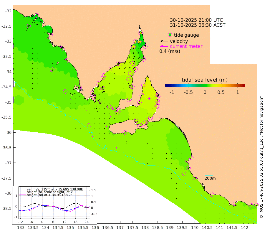 0cm/s -53T +10cm/s rms + 5cm/s 114T. SAM1DS 520m 2cm/s -79T +13cm/s rms + 5cm/s -36T. SAM2CP 100m 5cm/s -46T +21cm/s rms + 18cm/s 142T. SAM3MS 168m 7cm/s -38T +22cm/s rms + 0cm/s -30T. SAM4CY 117m 1cm/s -44T +23cm/s rms + 2cm/s 99T. SAM5CB 94m 5cm/s 26T +8cm/s rms + 3cm/s -172T. SAM6IS 83m 2cm/s -41T +11cm/s rms + 7cm/s 150T. SAM7DS 519m 11cm/s -11T +10cm/s rms + 2cm/s 87T. SAM8SG 47m 8cm/s 3T +20cm/s rms + 12cm/s -168T. NRSKAI 101m 16cm Warrnambool 15cm Port Fairy 16cm Portland 16cm Port Macdonnell 16cm Beachport 17cm Cape Rabelais (off) 14cm Robe 17cm Cape Jaffa 16cm Kingston 18cm Victor Harbor 14cm Vivonne Bay 24cm Kingscote 21cm American River 24cm Penneshaw 22cm Cape Jervis 29cm Second Valley 26cm Port Noarlunga 26cm Port Stanvac 29cm Brighton 29cm Glenelg 29cm Port Adelaide (Outer Harbor) 30cm Angus Inlet (Garden Island) 31cm Ardrossan 21cm Port Vincent 26cm Port Giles 17cm Stenhouse Bay 21cm Althorpe Island 14cm Pondalowie Bay 18cm Point Turton 17cm Port Victoria 20cm Cape Elizabeth 24cm Tiparra Reef Light 28cm Wallaroo 32cm Middle Bank 15cm Port Broughton 41cm Port Pirie 49cm Red Cliff Point (Beacon 5) 39cm Port Bonython 43cm Whyalla 41cm Western Shoal Beacon 25cm Franklin Harbor 29cm Franklin Harbor Entrance Beacon 24cm Arno Bay 27cm Port Neill 24cm Cape Hardy 23cm Tumby Bay 15cm Reevesby Island 18cm Port Lincoln 16cm Taylors Landing 18cm Whalers Bay 17cm Wedge Island Mooring 16cm Shelf Edge Mooring 13cm Coffin Bay Entrance Beacon 13cm Greenly Island 15cm Elliston 12cm Pearson Island 9cm Venus Bay 8cm Blanche Port (Streaky Bay) 7cm Thevenard 8cm St Francis Island