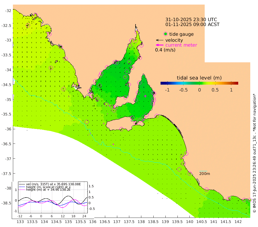 1cm/s -64T +10cm/s rms + 5cm/s 114T. SAM1DS 520m 1cm/s 18T +13cm/s rms + 5cm/s -36T. SAM2CP 100m 2cm/s -88T +21cm/s rms + 18cm/s 142T. SAM3MS 168m 6cm/s -55T +22cm/s rms + 0cm/s -30T. SAM4CY 117m 2cm/s -6T +23cm/s rms + 2cm/s 99T. SAM5CB 94m 2cm/s -11T +8cm/s rms + 3cm/s -172T. SAM6IS 83m 1cm/s -98T +11cm/s rms + 7cm/s 150T. SAM7DS 519m 7cm/s -2T +10cm/s rms + 2cm/s 87T. SAM8SG 47m 5cm/s 7T +20cm/s rms + 12cm/s -168T. NRSKAI 101m 13cm Warrnambool 14cm Port Fairy 15cm Portland 18cm Port Macdonnell 17cm Beachport 19cm Cape Rabelais (off) 16cm Robe 21cm Cape Jaffa 19cm Kingston 19cm Victor Harbor 18cm Vivonne Bay 3cm Kingscote 8cm American River 10cm Penneshaw 6cm Cape Jervis 5cm Second Valley -4cm Port Noarlunga -5cm Port Stanvac -3cm Brighton -4cm Glenelg -8cm Port Adelaide (Outer Harbor) -7cm Angus Inlet (Garden Island) -14cm Ardrossan -4cm Port Vincent -5cm Port Giles 12cm Stenhouse Bay 17cm Althorpe Island 14cm Pondalowie Bay 6cm Point Turton 9cm Port Victoria 10cm Cape Elizabeth 7cm Tiparra Reef Light 11cm Wallaroo 11cm Middle Bank 24cm Port Broughton 28cm Port Pirie 32cm Red Cliff Point (Beacon 5) 20cm Port Bonython 20cm Whyalla 19cm Western Shoal Beacon 4cm Franklin Harbor 6cm Franklin Harbor Entrance Beacon 8cm Arno Bay 10cm Port Neill 12cm Cape Hardy 15cm Tumby Bay 9cm Reevesby Island 14cm Port Lincoln 16cm Taylors Landing 12cm Whalers Bay 16cm Wedge Island Mooring 20cm Shelf Edge Mooring 22cm Coffin Bay Entrance Beacon 20cm Greenly Island 25cm Elliston 26cm Pearson Island 17cm Venus Bay 28cm Blanche Port (Streaky Bay) 27cm Thevenard 28cm St Francis Island