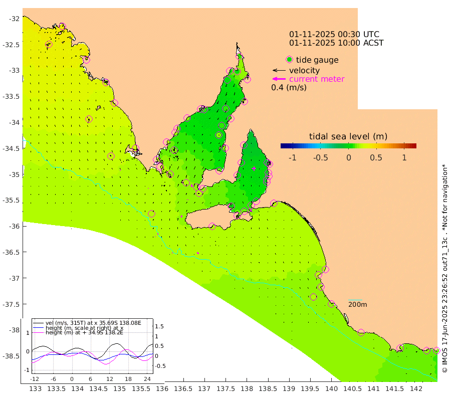 1cm/s -67T +10cm/s rms + 5cm/s 114T. SAM1DS 520m 1cm/s 37T +13cm/s rms + 5cm/s -36T. SAM2CP 100m 1cm/s -104T +21cm/s rms + 18cm/s 142T. SAM3MS 168m 6cm/s -67T +22cm/s rms + 0cm/s -30T. SAM4CY 117m 2cm/s -17T +23cm/s rms + 2cm/s 99T. SAM5CB 94m 2cm/s -4T +8cm/s rms + 3cm/s -172T. SAM6IS 83m 1cm/s -127T +11cm/s rms + 7cm/s 150T. SAM7DS 519m 8cm/s 2T +10cm/s rms + 2cm/s 87T. SAM8SG 47m 5cm/s 11T +20cm/s rms + 12cm/s -168T. NRSKAI 101m 13cm Warrnambool 15cm Port Fairy 17cm Portland 20cm Port Macdonnell 18cm Beachport 21cm Cape Rabelais (off) 19cm Robe 23cm Cape Jaffa 22cm Kingston 21cm Victor Harbor 19cm Vivonne Bay 6cm Kingscote 11cm American River 13cm Penneshaw 8cm Cape Jervis 5cm Second Valley -2cm Port Noarlunga -2cm Port Stanvac -1cm Brighton -2cm Glenelg -6cm Port Adelaide (Outer Harbor) -10cm Angus Inlet (Garden Island) -11cm Ardrossan 5cm Port Vincent 0cm Port Giles 17cm Stenhouse Bay 21cm Althorpe Island 18cm Pondalowie Bay 12cm Point Turton 17cm Port Victoria 16cm Cape Elizabeth 11cm Tiparra Reef Light 11cm Wallaroo 9cm Middle Bank 22cm Port Broughton 12cm Port Pirie 11cm Red Cliff Point (Beacon 5) 7cm Port Bonython 6cm Whyalla 7cm Western Shoal Beacon 4cm Franklin Harbor 11cm Franklin Harbor Entrance Beacon 15cm Arno Bay 18cm Port Neill 20cm Cape Hardy 23cm Tumby Bay 18cm Reevesby Island 22cm Port Lincoln 23cm Taylors Landing 18cm Whalers Bay 21cm Wedge Island Mooring 22cm Shelf Edge Mooring 27cm Coffin Bay Entrance Beacon 24cm Greenly Island 31cm Elliston 32cm Pearson Island 23cm Venus Bay 40cm Blanche Port (Streaky Bay) 38cm Thevenard 38cm St Francis Island
