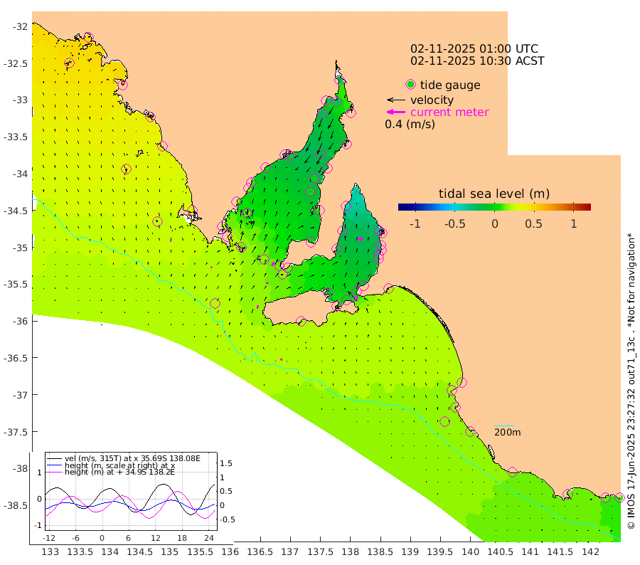 1cm/s -63T +10cm/s rms + 5cm/s 114T. SAM1DS 520m 3cm/s 59T +13cm/s rms + 5cm/s -36T. SAM2CP 100m 1cm/s 118T +21cm/s rms + 18cm/s 142T. SAM3MS 168m 4cm/s -68T +22cm/s rms + 0cm/s -30T. SAM4CY 117m 3cm/s -6T +23cm/s rms + 2cm/s 99T. SAM5CB 94m 4cm/s 38T +8cm/s rms + 3cm/s -172T. SAM6IS 83m 1cm/s 154T +11cm/s rms + 7cm/s 150T. SAM7DS 519m 9cm/s 32T +10cm/s rms + 2cm/s 87T. SAM8SG 47m 7cm/s 17T +20cm/s rms + 12cm/s -168T. NRSKAI 101m 11cm Warrnambool 13cm Port Fairy 14cm Portland 17cm Port Macdonnell 17cm Beachport 19cm Cape Rabelais (off) 17cm Robe 22cm Cape Jaffa 20cm Kingston 19cm Victor Harbor 19cm Vivonne Bay -9cm Kingscote -4cm American River 2cm Penneshaw -5cm Cape Jervis -14cm Second Valley -24cm Port Noarlunga -25cm Port Stanvac -24cm Brighton -25cm Glenelg -32cm Port Adelaide (Outer Harbor) -41cm Angus Inlet (Garden Island) -42cm Ardrossan -19cm Port Vincent -20cm Port Giles 13cm Stenhouse Bay 15cm Althorpe Island 15cm Pondalowie Bay 4cm Point Turton 8cm Port Victoria 5cm Cape Elizabeth -4cm Tiparra Reef Light -9cm Wallaroo -13cm Middle Bank 10cm Port Broughton -22cm Port Pirie -25cm Red Cliff Point (Beacon 5) -28cm Port Bonython -28cm Whyalla -25cm Western Shoal Beacon -13cm Franklin Harbor -4cm Franklin Harbor Entrance Beacon 5cm Arno Bay 8cm Port Neill 12cm Cape Hardy 17cm Tumby Bay 12cm Reevesby Island 19cm Port Lincoln 21cm Taylors Landing 12cm Whalers Bay 18cm Wedge Island Mooring 21cm Shelf Edge Mooring 28cm Coffin Bay Entrance Beacon 25cm Greenly Island 33cm Elliston 34cm Pearson Island 24cm Venus Bay 46cm Blanche Port (Streaky Bay) 45cm Thevenard 39cm St Francis Island