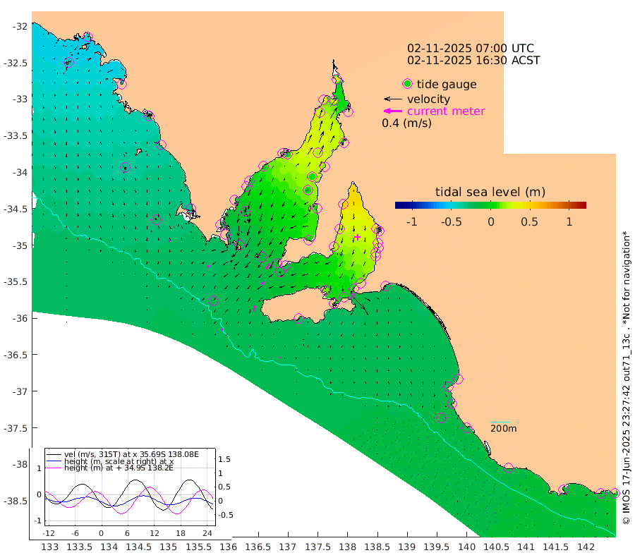 1cm/s -25T +10cm/s rms + 5cm/s 114T. SAM1DS 520m 5cm/s -142T +13cm/s rms + 5cm/s -36T. SAM2CP 100m 3cm/s -130T +21cm/s rms + 18cm/s 142T. SAM3MS 168m 3cm/s -157T +22cm/s rms + 0cm/s -30T. SAM4CY 117m 3cm/s 169T +23cm/s rms + 2cm/s 99T. SAM5CB 94m 7cm/s -138T +8cm/s rms + 3cm/s -172T. SAM6IS 83m 1cm/s -114T +11cm/s rms + 7cm/s 150T. SAM7DS 519m 13cm/s -147T +10cm/s rms + 2cm/s 87T. SAM8SG 47m 11cm/s -166T +20cm/s rms + 12cm/s -168T. NRSKAI 101m -12cm Warrnambool -14cm Port Fairy -14cm Portland -17cm Port Macdonnell -17cm Beachport -18cm Cape Rabelais (off) -17cm Robe -21cm Cape Jaffa -21cm Kingston -20cm Victor Harbor -22cm Vivonne Bay 12cm Kingscote 8cm American River 1cm Penneshaw 9cm Cape Jervis 17cm Second Valley 29cm Port Noarlunga 30cm Port Stanvac 31cm Brighton 33cm Glenelg 39cm Port Adelaide (Outer Harbor) 51cm Angus Inlet (Garden Island) 50cm Ardrossan 23cm Port Vincent 24cm Port Giles -11cm Stenhouse Bay -15cm Althorpe Island -12cm Pondalowie Bay -2cm Point Turton 0cm Port Victoria 0cm Cape Elizabeth 6cm Tiparra Reef Light 15cm Wallaroo 20cm Middle Bank 10cm Port Broughton 33cm Port Pirie 33cm Red Cliff Point (Beacon 5) 41cm Port Bonython 38cm Whyalla 29cm Western Shoal Beacon 14cm Franklin Harbor 2cm Franklin Harbor Entrance Beacon -4cm Arno Bay -9cm Port Neill -12cm Cape Hardy -17cm Tumby Bay -16cm Reevesby Island -20cm Port Lincoln -23cm Taylors Landing -9cm Whalers Bay -17cm Wedge Island Mooring -22cm Shelf Edge Mooring -31cm Coffin Bay Entrance Beacon -25cm Greenly Island -34cm Elliston -30cm Pearson Island -25cm Venus Bay -48cm Blanche Port (Streaky Bay) -48cm Thevenard -39cm St Francis Island
