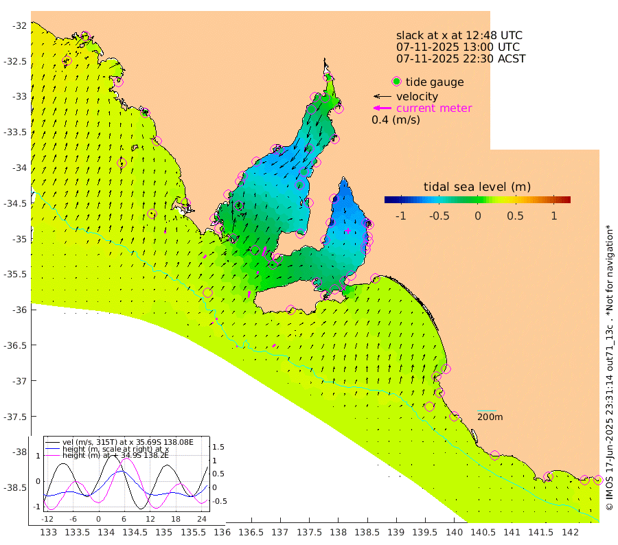 1cm/s 83T +10cm/s rms + 5cm/s 114T. SAM1DS 520m 9cm/s 44T +13cm/s rms + 5cm/s -36T. SAM2CP 100m 5cm/s 9T +21cm/s rms + 18cm/s 142T. SAM3MS 168m 9cm/s 42T +22cm/s rms + 0cm/s -30T. SAM4CY 117m 7cm/s 10T +23cm/s rms + 2cm/s 99T. SAM5CB 94m 6cm/s 22T +8cm/s rms + 3cm/s -172T. SAM6IS 83m 3cm/s -20T +11cm/s rms + 7cm/s 150T. SAM7DS 519m 23cm/s 19T +10cm/s rms + 2cm/s 87T. SAM8SG 47m 15cm/s 11T +20cm/s rms + 12cm/s -168T. NRSKAI 101m 29cm Warrnambool 28cm Port Fairy 28cm Portland 22cm Port Macdonnell 29cm Beachport 27cm Cape Rabelais (off) 25cm Robe 22cm Cape Jaffa 21cm Kingston 23cm Victor Harbor 34cm Vivonne Bay -37cm Kingscote -31cm American River -21cm Penneshaw -26cm Cape Jervis -44cm Second Valley -65cm Port Noarlunga -69cm Port Stanvac -71cm Brighton -76cm Glenelg -82cm Port Adelaide (Outer Harbor) -72cm Angus Inlet (Garden Island) -103cm Ardrossan -90cm Port Vincent -70cm Port Giles -3cm Stenhouse Bay -2cm Althorpe Island 0cm Pondalowie Bay -24cm Point Turton -27cm Port Victoria -29cm Cape Elizabeth -27cm Tiparra Reef Light -26cm Wallaroo -25cm Middle Bank -25cm Port Broughton 8cm Port Pirie 7cm Red Cliff Point (Beacon 5) 1cm Port Bonython -8cm Whyalla -14cm Western Shoal Beacon -41cm Franklin Harbor -31cm Franklin Harbor Entrance Beacon -24cm Arno Bay -26cm Port Neill -16cm Cape Hardy -10cm Tumby Bay -6cm Reevesby Island 1cm Port Lincoln 14cm Taylors Landing -15cm Whalers Bay 6cm Wedge Island Mooring 28cm Shelf Edge Mooring 24cm Coffin Bay Entrance Beacon 31cm Greenly Island 26cm Elliston 32cm Pearson Island 10cm Venus Bay 25cm Blanche Port (Streaky Bay) 29cm Thevenard 39cm St Francis Island