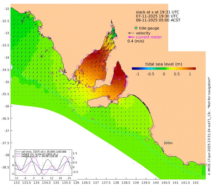 1cm/s -93T +10cm/s rms + 5cm/s 114T. SAM1DS 520m 11cm/s -109T +13cm/s rms + 5cm/s -36T. SAM2CP 100m 9cm/s -65T +21cm/s rms + 18cm/s 142T. SAM3MS 168m 11cm/s -74T +22cm/s rms + 0cm/s -30T. SAM4CY 117m 6cm/s -145T +23cm/s rms + 2cm/s 99T. SAM5CB 94m 2cm/s -15T +8cm/s rms + 3cm/s -172T. SAM6IS 83m 3cm/s -54T +11cm/s rms + 7cm/s 150T. SAM7DS 519m 17cm/s -42T +10cm/s rms + 2cm/s 87T. SAM8SG 47m 6cm/s -8T +20cm/s rms + 12cm/s -168T. NRSKAI 101m 17cm Warrnambool 16cm Port Fairy 17cm Portland 22cm Port Macdonnell 16cm Beachport 17cm Cape Rabelais (off) 18cm Robe 23cm Cape Jaffa 20cm Kingston 26cm Victor Harbor 10cm Vivonne Bay 95cm Kingscote 84cm American River 77cm Penneshaw 79cm Cape Jervis 103cm Second Valley 126cm Port Noarlunga 130cm Port Stanvac 132cm Brighton 137cm Glenelg 146cm Port Adelaide (Outer Harbor) 136cm Angus Inlet (Garden Island) 173cm Ardrossan 151cm Port Vincent 131cm Port Giles 48cm Stenhouse Bay 52cm Althorpe Island 41cm Pondalowie Bay 78cm Point Turton 78cm Port Victoria 84cm Cape Elizabeth 90cm Tiparra Reef Light 93cm Wallaroo 101cm Middle Bank 33cm Port Broughton 68cm Port Pirie 69cm Red Cliff Point (Beacon 5) 81cm Port Bonython 93cm Whyalla 96cm Western Shoal Beacon 102cm Franklin Harbor 108cm Franklin Harbor Entrance Beacon 94cm Arno Bay 97cm Port Neill 83cm Cape Hardy 75cm Tumby Bay 69cm Reevesby Island 58cm Port Lincoln 38cm Taylors Landing 67cm Whalers Bay 44cm Wedge Island Mooring 19cm Shelf Edge Mooring 22cm Coffin Bay Entrance Beacon 13cm Greenly Island 18cm Elliston 10cm Pearson Island 25cm Venus Bay 20cm Blanche Port (Streaky Bay) 14cm Thevenard 6cm St Francis Island