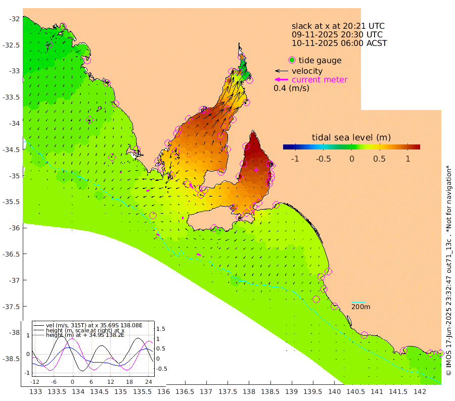 1cm/s -69T +10cm/s rms + 5cm/s 114T. SAM1DS 520m 10cm/s -107T +13cm/s rms + 5cm/s -36T. SAM2CP 100m 10cm/s -66T +21cm/s rms + 18cm/s 142T. SAM3MS 168m 12cm/s -67T +22cm/s rms + 0cm/s -30T. SAM4CY 117m 5cm/s -141T +23cm/s rms + 2cm/s 99T. SAM5CB 94m 3cm/s -25T +8cm/s rms + 3cm/s -172T. SAM6IS 83m 3cm/s -60T +11cm/s rms + 7cm/s 150T. SAM7DS 519m 18cm/s -36T +10cm/s rms + 2cm/s 87T. SAM8SG 47m 7cm/s -7T +20cm/s rms + 12cm/s -168T. NRSKAI 101m 18cm Warrnambool 19cm Port Fairy 19cm Portland 25cm Port Macdonnell 19cm Beachport 21cm Cape Rabelais (off) 20cm Robe 26cm Cape Jaffa 22cm Kingston 29cm Victor Harbor 14cm Vivonne Bay 87cm Kingscote 78cm American River 72cm Penneshaw 74cm Cape Jervis 97cm Second Valley 114cm Port Noarlunga 118cm Port Stanvac 120cm Brighton 124cm Glenelg 132cm Port Adelaide (Outer Harbor) 126cm Angus Inlet (Garden Island) 154cm Ardrossan 136cm Port Vincent 117cm Port Giles 45cm Stenhouse Bay 48cm Althorpe Island 39cm Pondalowie Bay 70cm Point Turton 71cm Port Victoria 79cm Cape Elizabeth 81cm Tiparra Reef Light 88cm Wallaroo 97cm Middle Bank 35cm Port Broughton 78cm Port Pirie 82cm Red Cliff Point (Beacon 5) 87cm Port Bonython 98cm Whyalla 97cm Western Shoal Beacon 96cm Franklin Harbor 99cm Franklin Harbor Entrance Beacon 85cm Arno Bay 85cm Port Neill 75cm Cape Hardy 68cm Tumby Bay 61cm Reevesby Island 53cm Port Lincoln 37cm Taylors Landing 60cm Whalers Bay 43cm Wedge Island Mooring 23cm Shelf Edge Mooring 24cm Coffin Bay Entrance Beacon 17cm Greenly Island 21cm Elliston 15cm Pearson Island 24cm Venus Bay 20cm Blanche Port (Streaky Bay) 15cm Thevenard 5cm St Francis Island