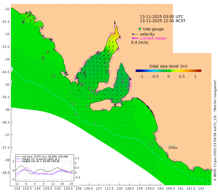 1cm/s -83T +10cm/s rms + 5cm/s 114T. SAM1DS 520m 3cm/s -166T +13cm/s rms + 5cm/s -36T. SAM2CP 100m 6cm/s -162T +21cm/s rms + 18cm/s 142T. SAM3MS 168m 7cm/s -107T +22cm/s rms + 0cm/s -30T. SAM4CY 117m 1cm/s 145T +23cm/s rms + 2cm/s 99T. SAM5CB 94m 6cm/s -129T +8cm/s rms + 3cm/s -172T. SAM6IS 83m 3cm/s -173T +11cm/s rms + 7cm/s 150T. SAM7DS 519m 11cm/s -155T +10cm/s rms + 2cm/s 87T. SAM8SG 47m 9cm/s -170T +20cm/s rms + 12cm/s -168T. NRSKAI 101m 8cm Warrnambool 7cm Port Fairy 6cm Portland 5cm Port Macdonnell 4cm Beachport 5cm Cape Rabelais (off) 6cm Robe 8cm Cape Jaffa 6cm Kingston 2cm Victor Harbor -1cm Vivonne Bay -8cm Kingscote -5cm American River -8cm Penneshaw -6cm Cape Jervis -11cm Second Valley -14cm Port Noarlunga -14cm Port Stanvac -15cm Brighton -15cm Glenelg -17cm Port Adelaide (Outer Harbor) -8cm Angus Inlet (Garden Island) -26cm Ardrossan -22cm Port Vincent -17cm Port Giles -2cm Stenhouse Bay 0cm Althorpe Island 4cm Pondalowie Bay 4cm Point Turton 9cm Port Victoria 6cm Cape Elizabeth 6cm Tiparra Reef Light 15cm Wallaroo 13cm Middle Bank 36cm Port Broughton 39cm Port Pirie 35cm Red Cliff Point (Beacon 5) 31cm Port Bonython 28cm Whyalla 23cm Western Shoal Beacon 9cm Franklin Harbor -2cm Franklin Harbor Entrance Beacon -3cm Arno Bay -7cm Port Neill -6cm Cape Hardy -6cm Tumby Bay -3cm Reevesby Island -3cm Port Lincoln -2cm Taylors Landing 2cm Whalers Bay 1cm Wedge Island Mooring 2cm Shelf Edge Mooring 4cm Coffin Bay Entrance Beacon 3cm Greenly Island 4cm Elliston 3cm Pearson Island 5cm Venus Bay 7cm Blanche Port (Streaky Bay) 7cm Thevenard 2cm St Francis Island