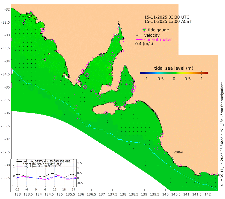 1cm/s -67T +10cm/s rms + 5cm/s 114T. SAM1DS 520m 2cm/s -175T +13cm/s rms + 5cm/s -36T. SAM2CP 100m 3cm/s -171T +21cm/s rms + 18cm/s 142T. SAM3MS 168m 3cm/s -136T +22cm/s rms + 0cm/s -30T. SAM4CY 117m 2cm/s -180T +23cm/s rms + 2cm/s 99T. SAM5CB 94m 0cm/s 4T +8cm/s rms + 3cm/s -172T. SAM6IS 83m 2cm/s 165T +11cm/s rms + 7cm/s 150T. SAM7DS 519m 4cm/s -166T +10cm/s rms + 2cm/s 87T. SAM8SG 47m 4cm/s -174T +20cm/s rms + 12cm/s -168T. NRSKAI 101m -6cm Warrnambool -6cm Port Fairy -6cm Portland -5cm Port Macdonnell -4cm Beachport -4cm Cape Rabelais (off) -3cm Robe -2cm Cape Jaffa -3cm Kingston -4cm Victor Harbor -7cm Vivonne Bay 1cm Kingscote 0cm American River -2cm Penneshaw -1cm Cape Jervis -4cm Second Valley 1cm Port Noarlunga 2cm Port Stanvac 2cm Brighton 4cm Glenelg 3cm Port Adelaide (Outer Harbor) 1cm Angus Inlet (Garden Island) 3cm Ardrossan 8cm Port Vincent 3cm Port Giles -1cm Stenhouse Bay -3cm Althorpe Island 2cm Pondalowie Bay 5cm Point Turton 10cm Port Victoria 8cm Cape Elizabeth 1cm Tiparra Reef Light 1cm Wallaroo 0cm Middle Bank 6cm Port Broughton -10cm Port Pirie -15cm Red Cliff Point (Beacon 5) -6cm Port Bonython -9cm Whyalla -11cm Western Shoal Beacon 3cm Franklin Harbor 3cm Franklin Harbor Entrance Beacon 5cm Arno Bay 4cm Port Neill 2cm Cape Hardy 2cm Tumby Bay 2cm Reevesby Island 2cm Port Lincoln 0cm Taylors Landing 3cm Whalers Bay 1cm Wedge Island Mooring -3cm Shelf Edge Mooring 0cm Coffin Bay Entrance Beacon -2cm Greenly Island 0cm Elliston -1cm Pearson Island 2cm Venus Bay 5cm Blanche Port (Streaky Bay) 5cm Thevenard -9cm St Francis Island