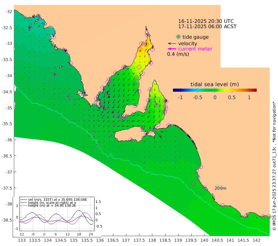 1cm/s -85T +10cm/s rms + 5cm/s 114T. SAM1DS 520m 6cm/s -133T +13cm/s rms + 5cm/s -36T. SAM2CP 100m 5cm/s -129T +21cm/s rms + 18cm/s 142T. SAM3MS 168m 4cm/s -72T +22cm/s rms + 0cm/s -30T. SAM4CY 117m 2cm/s 145T +23cm/s rms + 2cm/s 99T. SAM5CB 94m 9cm/s -134T +8cm/s rms + 3cm/s -172T. SAM6IS 83m 2cm/s -131T +11cm/s rms + 7cm/s 150T. SAM7DS 519m 16cm/s -144T +10cm/s rms + 2cm/s 87T. SAM8SG 47m 11cm/s -162T +20cm/s rms + 12cm/s -168T. NRSKAI 101m 2cm Warrnambool 0cm Port Fairy -1cm Portland -3cm Port Macdonnell -6cm Beachport -5cm Cape Rabelais (off) -6cm Robe -5cm Cape Jaffa -4cm Kingston -8cm Victor Harbor -11cm Vivonne Bay -1cm Kingscote 2cm American River -4cm Penneshaw 2cm Cape Jervis 11cm Second Valley 6cm Port Noarlunga 7cm Port Stanvac 8cm Brighton 8cm Glenelg 10cm Port Adelaide (Outer Harbor) 26cm Angus Inlet (Garden Island) 9cm Ardrossan -12cm Port Vincent -1cm Port Giles -11cm Stenhouse Bay -4cm Althorpe Island -10cm Pondalowie Bay -6cm Point Turton -8cm Port Victoria -4cm Cape Elizabeth 9cm Tiparra Reef Light 24cm Wallaroo 26cm Middle Bank 38cm Port Broughton 78cm Port Pirie 93cm Red Cliff Point (Beacon 5) 65cm Port Bonython 68cm Whyalla 63cm Western Shoal Beacon 17cm Franklin Harbor 0cm Franklin Harbor Entrance Beacon -11cm Arno Bay -12cm Port Neill -14cm Cape Hardy -17cm Tumby Bay -20cm Reevesby Island -21cm Port Lincoln -21cm Taylors Landing -9cm Whalers Bay -14cm Wedge Island Mooring -11cm Shelf Edge Mooring -18cm Coffin Bay Entrance Beacon -16cm Greenly Island -18cm Elliston -22cm Pearson Island -14cm Venus Bay -33cm Blanche Port (Streaky Bay) -34cm Thevenard -21cm St Francis Island