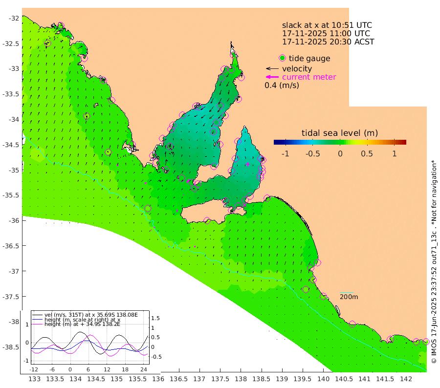 1cm/s 104T +10cm/s rms + 5cm/s 114T. SAM1DS 520m 6cm/s 48T +13cm/s rms + 5cm/s -36T. SAM2CP 100m 2cm/s 35T +21cm/s rms + 18cm/s 142T. SAM3MS 168m 5cm/s 59T +22cm/s rms + 0cm/s -30T. SAM4CY 117m 5cm/s 8T +23cm/s rms + 2cm/s 99T. SAM5CB 94m 1cm/s 25T +8cm/s rms + 3cm/s -172T. SAM6IS 83m 1cm/s -10T +11cm/s rms + 7cm/s 150T. SAM7DS 519m 11cm/s 32T +10cm/s rms + 2cm/s 87T. SAM8SG 47m 7cm/s 14T +20cm/s rms + 12cm/s -168T. NRSKAI 101m 12cm Warrnambool 13cm Port Fairy 13cm Portland 11cm Port Macdonnell 14cm Beachport 13cm Cape Rabelais (off) 11cm Robe 9cm Cape Jaffa 9cm Kingston 10cm Victor Harbor 18cm Vivonne Bay -23cm Kingscote -18cm American River -14cm Penneshaw -17cm Cape Jervis -26cm Second Valley -38cm Port Noarlunga -40cm Port Stanvac -41cm Brighton -44cm Glenelg -47cm Port Adelaide (Outer Harbor) -39cm Angus Inlet (Garden Island) -59cm Ardrossan -48cm Port Vincent -40cm Port Giles -3cm Stenhouse Bay -4cm Althorpe Island -2cm Pondalowie Bay -18cm Point Turton -20cm Port Victoria -22cm Cape Elizabeth -21cm Tiparra Reef Light -20cm Wallaroo -20cm Middle Bank -17cm Port Broughton 1cm Port Pirie -2cm Red Cliff Point (Beacon 5) 0cm Port Bonython -9cm Whyalla -14cm Western Shoal Beacon -26cm Franklin Harbor -24cm Franklin Harbor Entrance Beacon -20cm Arno Bay -21cm Port Neill -19cm Cape Hardy -15cm Tumby Bay -8cm Reevesby Island -4cm Port Lincoln 6cm Taylors Landing -13cm Whalers Bay 1cm Wedge Island Mooring 14cm Shelf Edge Mooring 11cm Coffin Bay Entrance Beacon 15cm Greenly Island 11cm Elliston 17cm Pearson Island 3cm Venus Bay 9cm Blanche Port (Streaky Bay) 13cm Thevenard 20cm St Francis Island