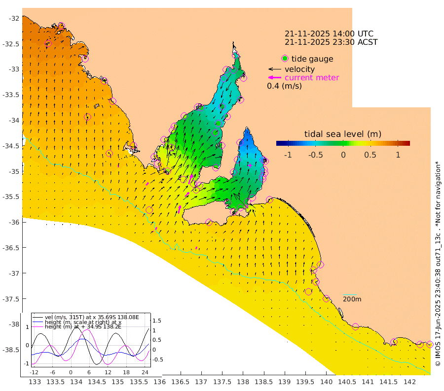1cm/s 72T +10cm/s rms + 5cm/s 114T. SAM1DS 520m 10cm/s 38T +13cm/s rms + 5cm/s -36T. SAM2CP 100m 8cm/s 22T +21cm/s rms + 18cm/s 142T. SAM3MS 168m 7cm/s 23T +22cm/s rms + 0cm/s -30T. SAM4CY 117m 7cm/s -8T +23cm/s rms + 2cm/s 99T. SAM5CB 94m 18cm/s 45T +8cm/s rms + 3cm/s -172T. SAM6IS 83m 3cm/s 11T +11cm/s rms + 7cm/s 150T. SAM7DS 519m 32cm/s 21T +10cm/s rms + 2cm/s 87T. SAM8SG 47m 25cm/s 12T +20cm/s rms + 12cm/s -168T. NRSKAI 101m 45cm Warrnambool 43cm Port Fairy 45cm Portland 40cm Port Macdonnell 46cm Beachport 47cm Cape Rabelais (off) 45cm Robe 43cm Cape Jaffa 45cm Kingston 46cm Victor Harbor 52cm Vivonne Bay -14cm Kingscote -12cm American River 3cm Penneshaw -10cm Cape Jervis -31cm Second Valley -47cm Port Noarlunga -50cm Port Stanvac -53cm Brighton -56cm Glenelg -66cm Port Adelaide (Outer Harbor) -74cm Angus Inlet (Garden Island) -84cm Ardrossan -55cm Port Vincent -42cm Port Giles 27cm Stenhouse Bay 29cm Althorpe Island 27cm Pondalowie Bay 11cm Point Turton 4cm Port Victoria 0cm Cape Elizabeth 2cm Tiparra Reef Light -13cm Wallaroo -17cm Middle Bank -26cm Port Broughton -33cm Port Pirie -42cm Red Cliff Point (Beacon 5) -28cm Port Bonython -37cm Whyalla -34cm Western Shoal Beacon -26cm Franklin Harbor 3cm Franklin Harbor Entrance Beacon 16cm Arno Bay 26cm Port Neill 26cm Cape Hardy 33cm Tumby Bay 35cm Reevesby Island 42cm Port Lincoln 49cm Taylors Landing 18cm Whalers Bay 37cm Wedge Island Mooring 49cm Shelf Edge Mooring 56cm Coffin Bay Entrance Beacon 52cm Greenly Island 57cm Elliston 59cm Pearson Island 40cm Venus Bay 72cm Blanche Port (Streaky Bay) 75cm Thevenard 71cm St Francis Island